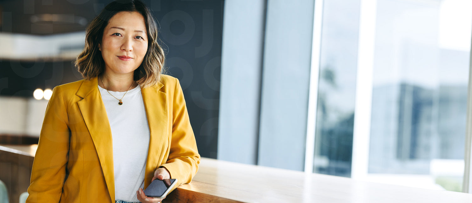 Female entrepreneur looking at the camera while standing with a smartphone in her hand. Ethnic businesswoman working remotely in a co-working space.