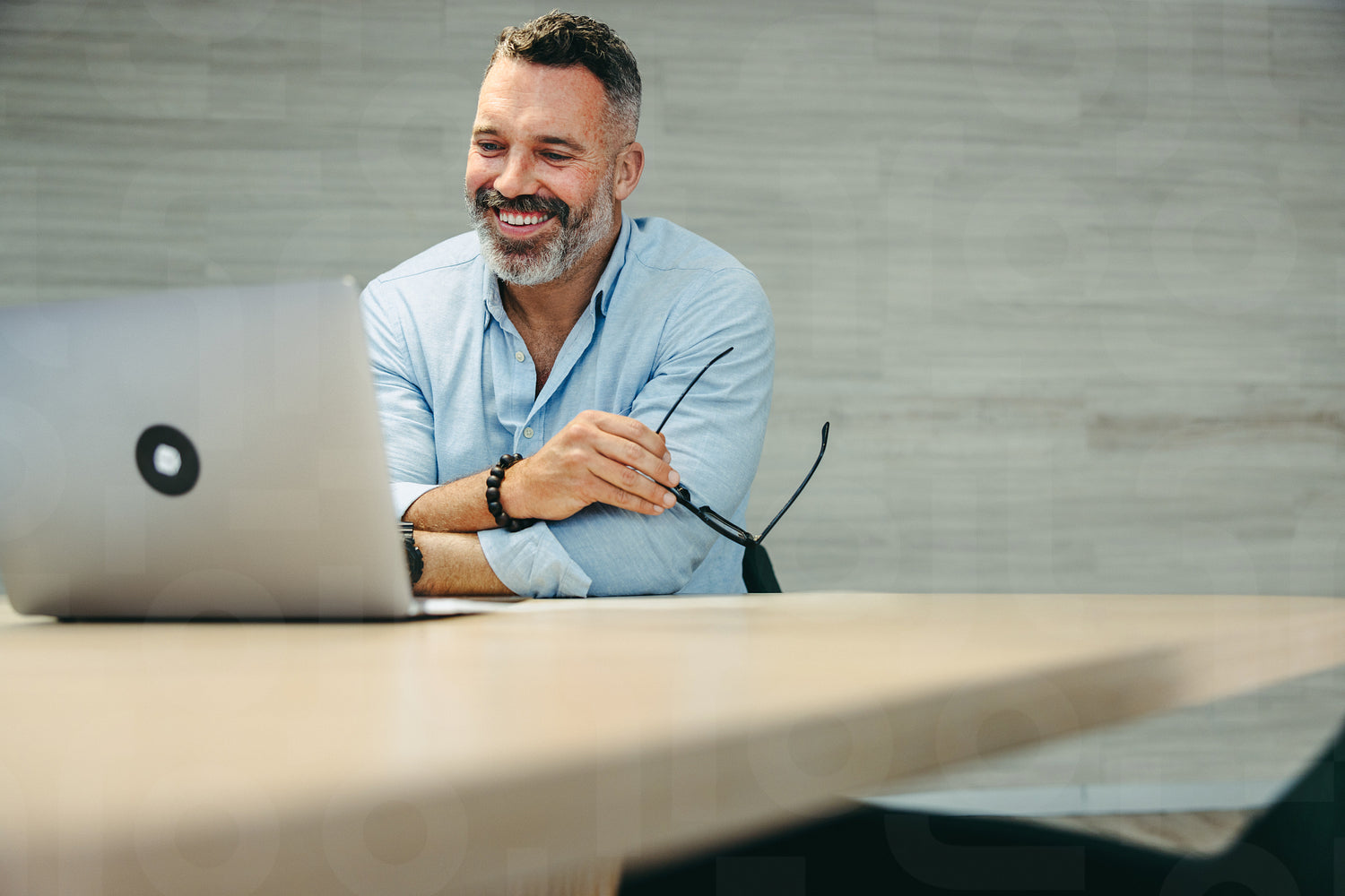 Happy mature businessman attending an online meeting with his business associates. Cheerful entrepreneur having a video conference while working remotely in a modern co-working office.