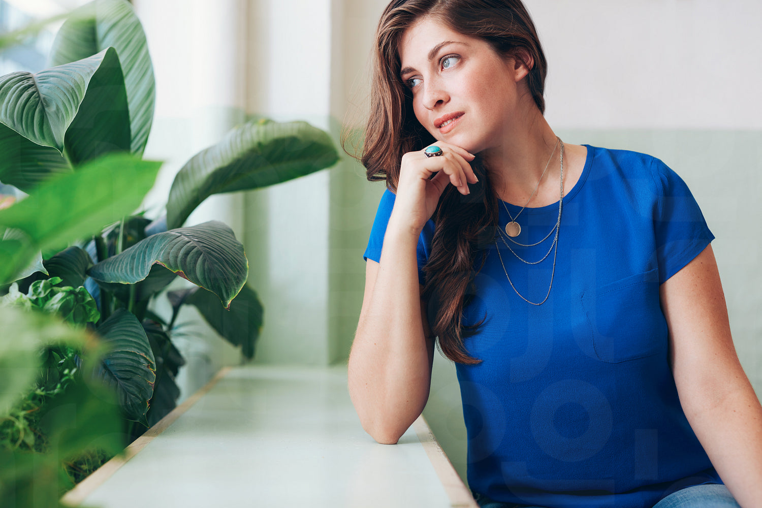 Attractive young woman sitting at a counter with her hands on chin and looking away thinking
