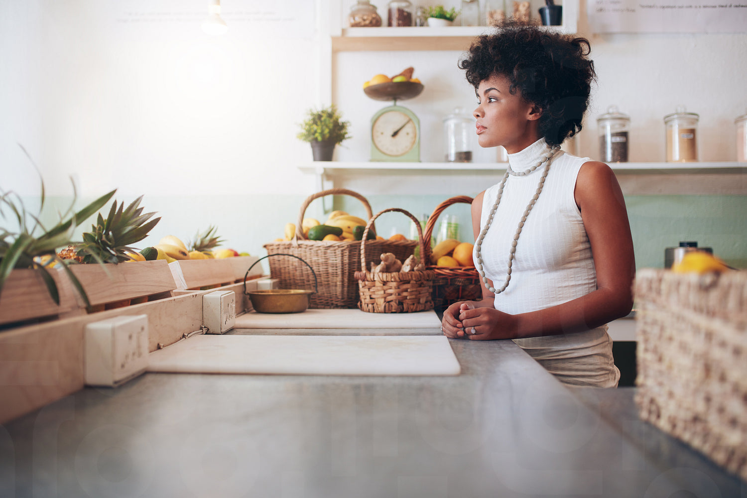 Side portrait of beautiful young woman behind juice bar counter. African female fruit juice bar owner.