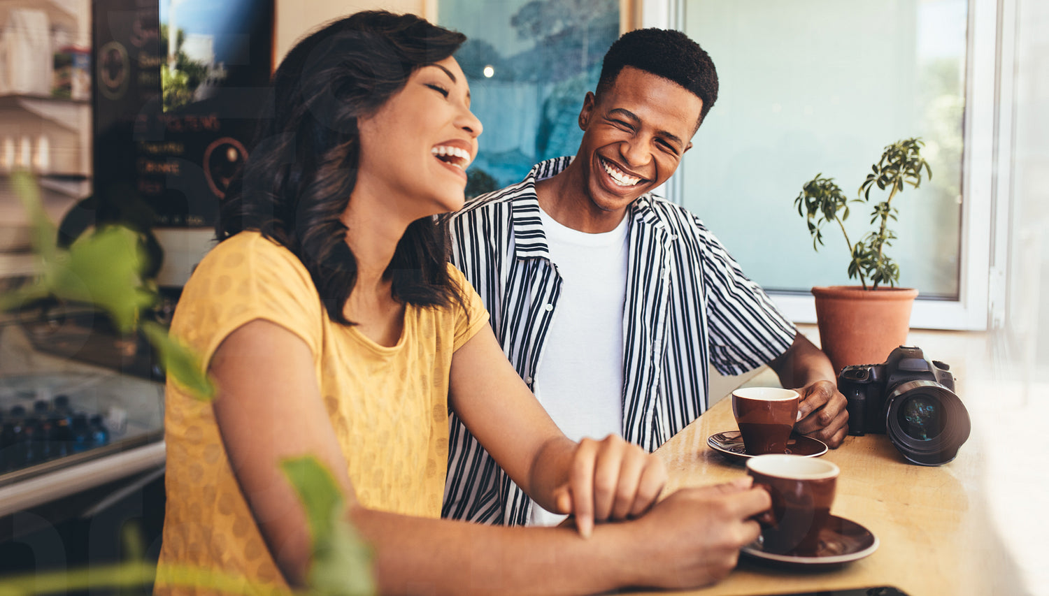 Male and female friends talking and smiling at cafe. Creative people meet up at cafe, having a great time together.