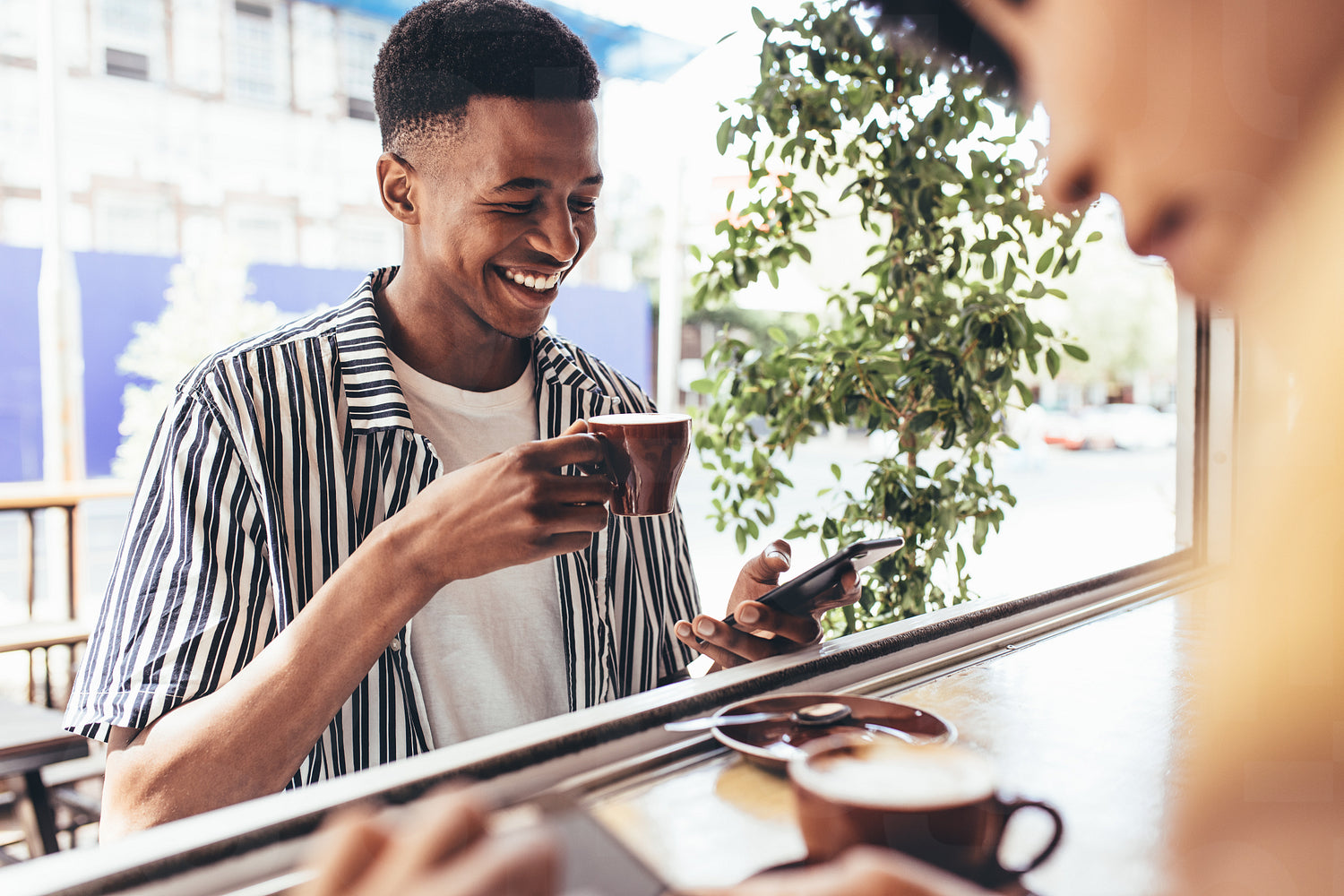 Smiling young african man having coffee and using mobile phone at cafe. Young guy updating his social media status from a cafe.