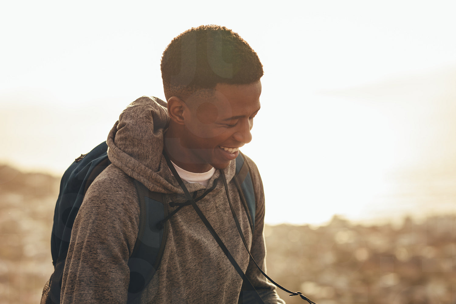 Man looking at the pictures on his camera. Man on hiking taking pictures for his social media posts.