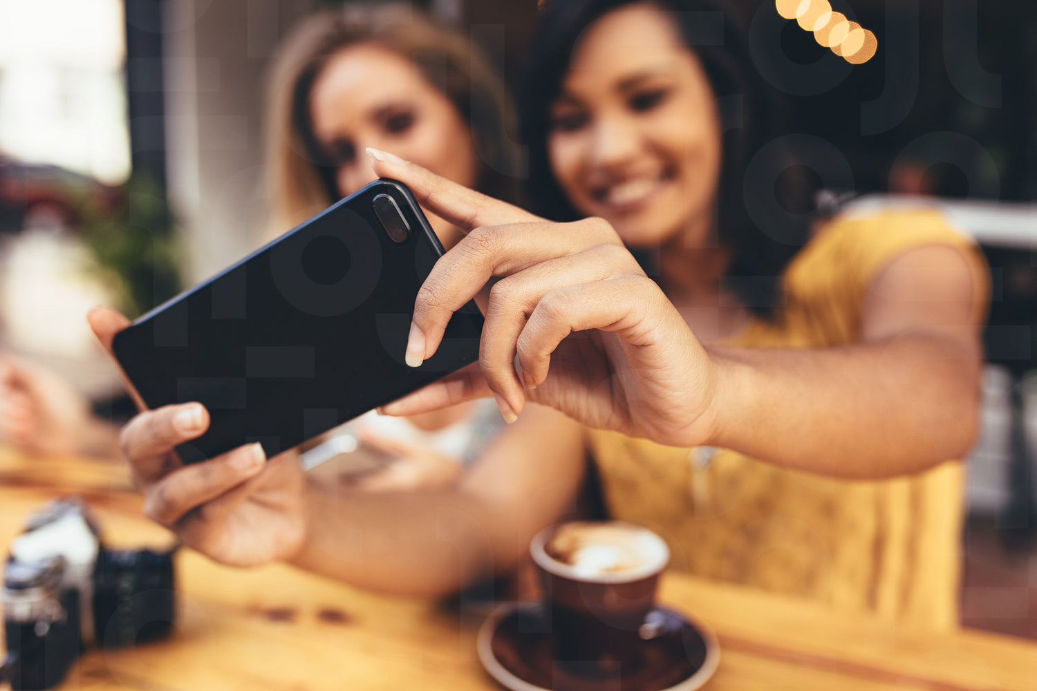 Close up of female hands taking selfie with smart phone at cafe. Focus on mobile phone. One selfie