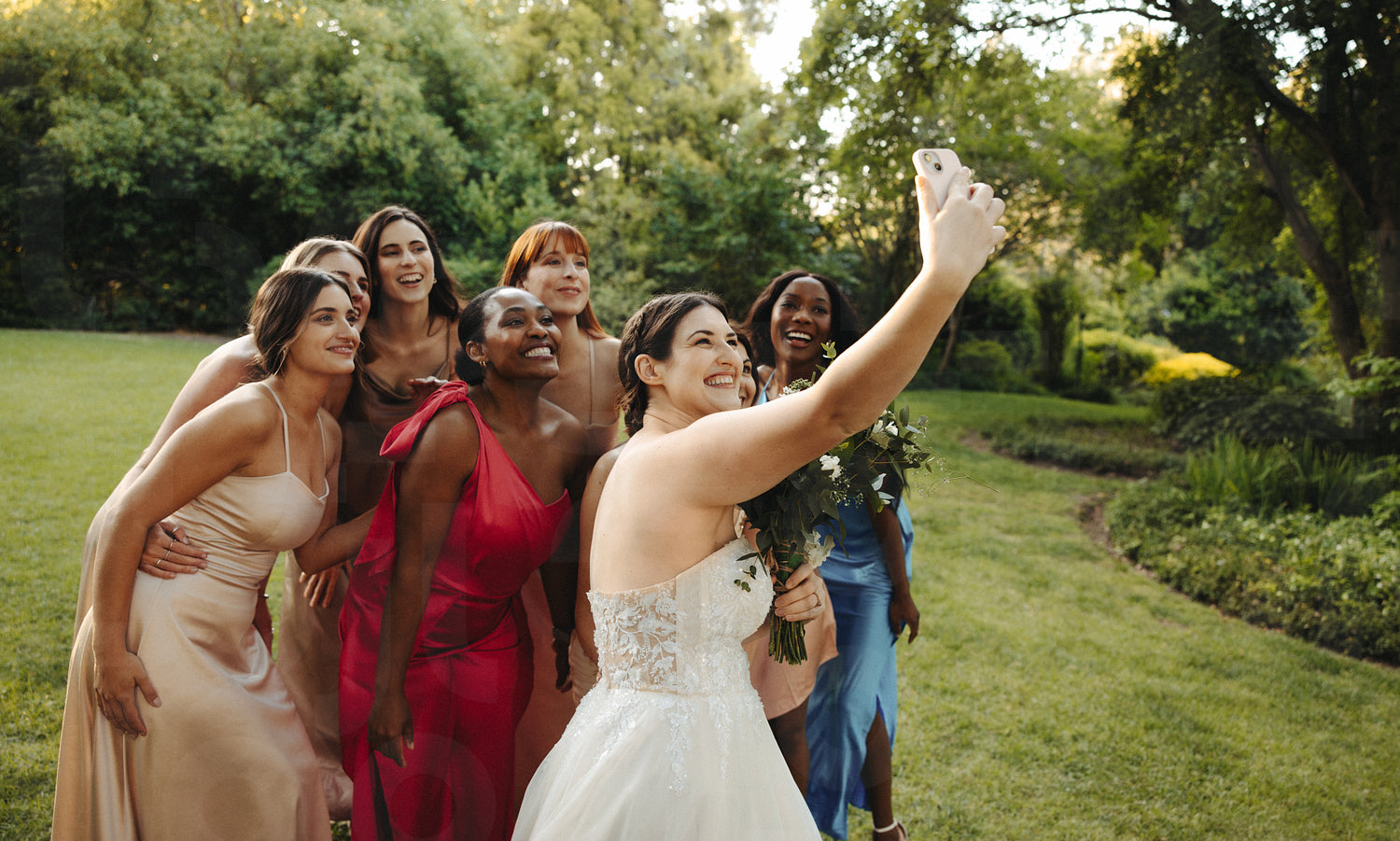 Bride and bridesmaids taking a selfie in a scenic garden setting