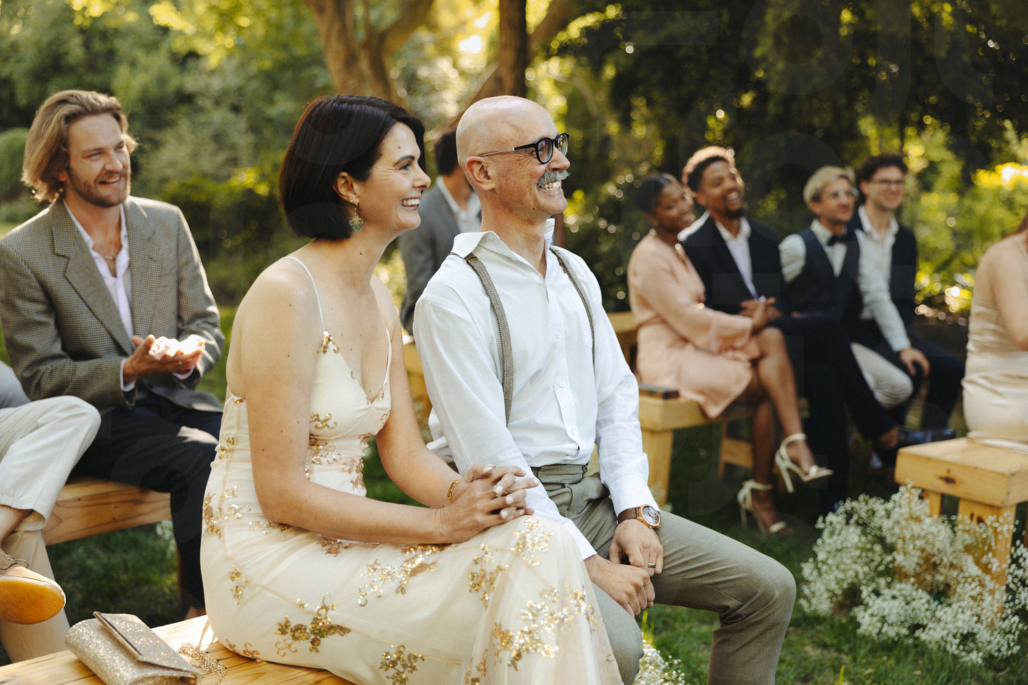 Smiling guests enjoy an elegant outdoor wedding ceremony surrounded by greenery and decor.