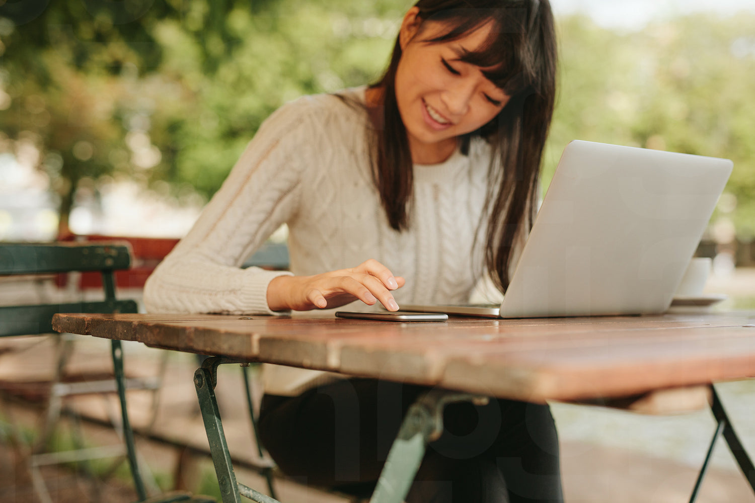 Image of young asian woman sitting at a table with laptop and using mobile phone in a outdoor cafe. Female reading a text message on her mobile phone with laptop on table.