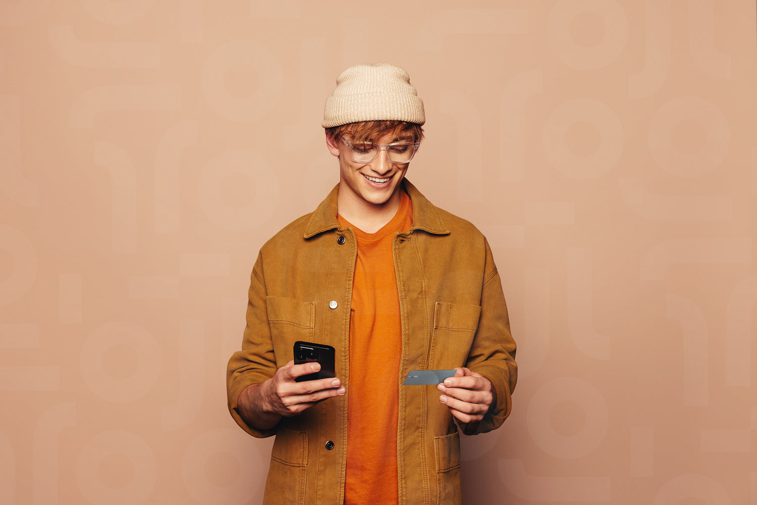 Cheerful young man in casual clothes stands in a studio with a peach backdrop. He holds a smartphone and credit card, using a mobile banking app for easy online payments and shopping.