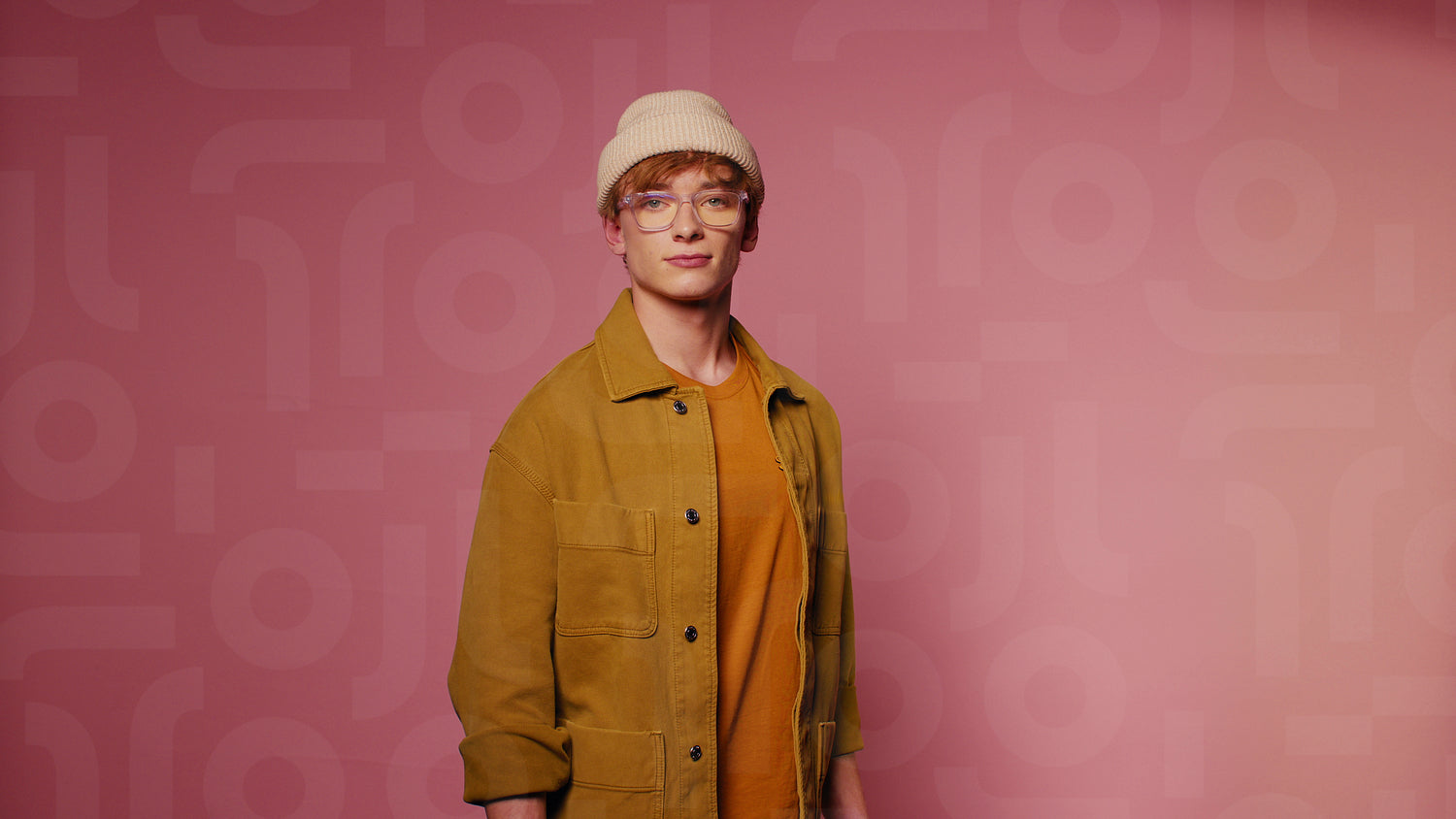 Portrait of a young man in a beanie, glasses, and an overshirt standing calmly against a pink background, looking at the camera.