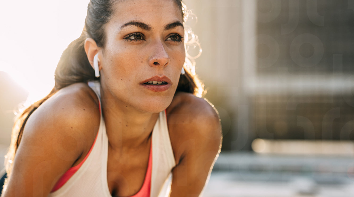 Shot of a sporty woman wearing earphones looking away and focusing on her workout. Female in sportswear concentrating during workout break outdoors in the city.