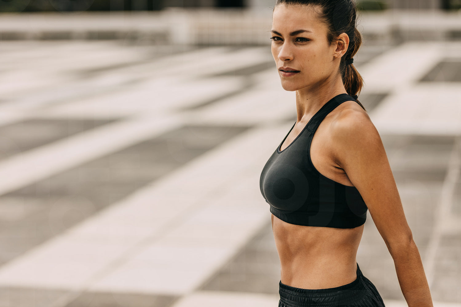 Fit woman looking away thoughtfully. Woman in sportswear exercising in the city.