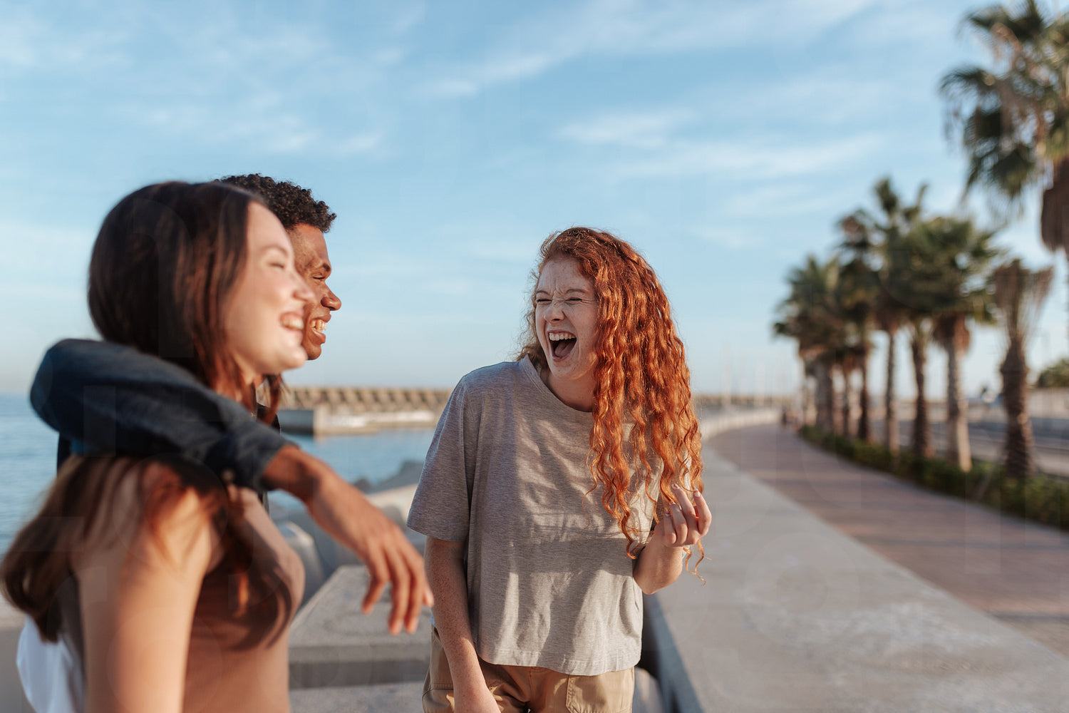 Laughter along the promenade. Happy young woman laughing with her two friends outdoors next to the sea. Group of three multicultural friends having a good time together on the weekend.