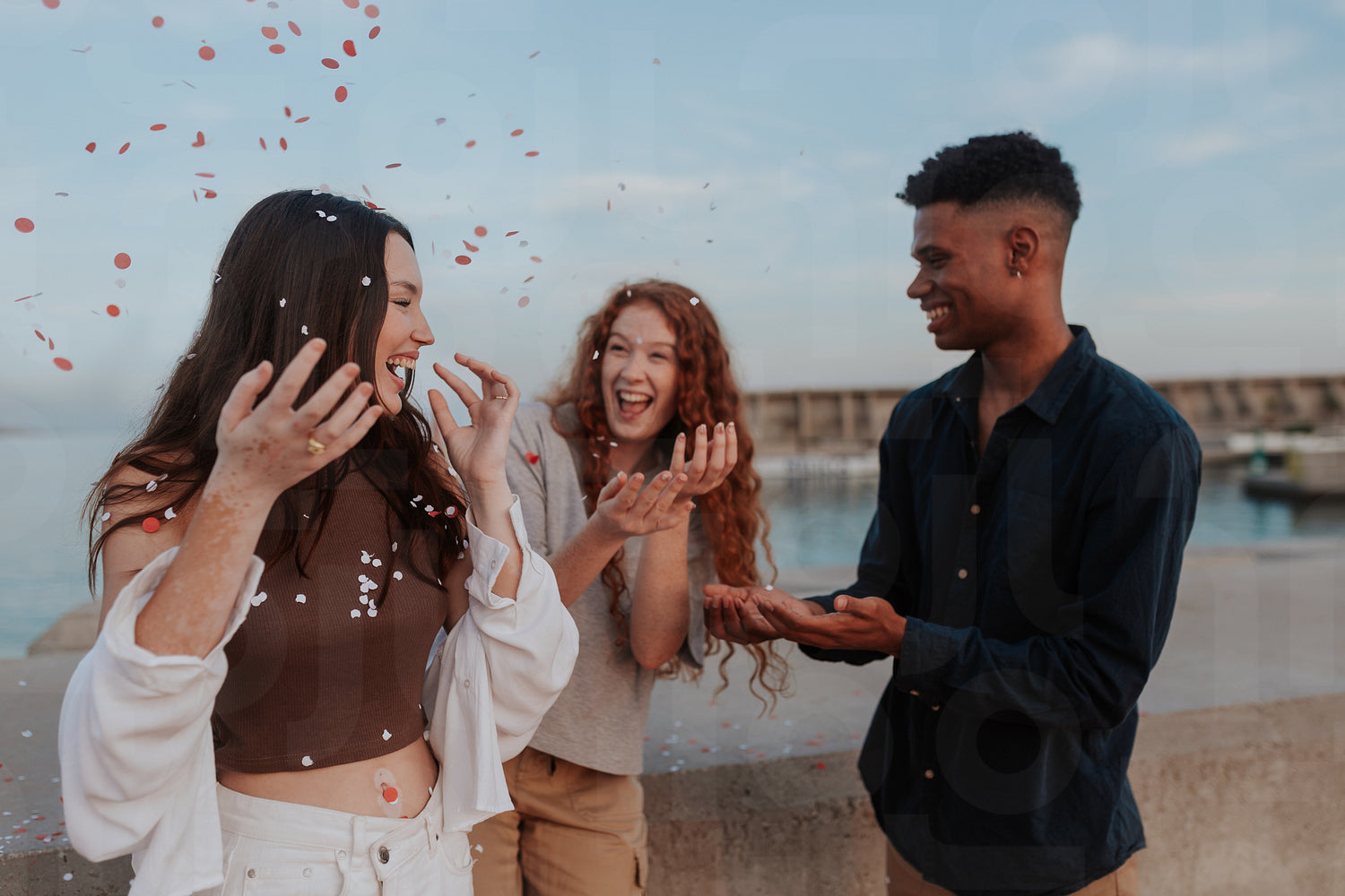 Throwing a confetti party by the sea. Group of multicultural friends celebrating with red and white confetti next to the sea. Three happy friends having a good time together on the weekend.