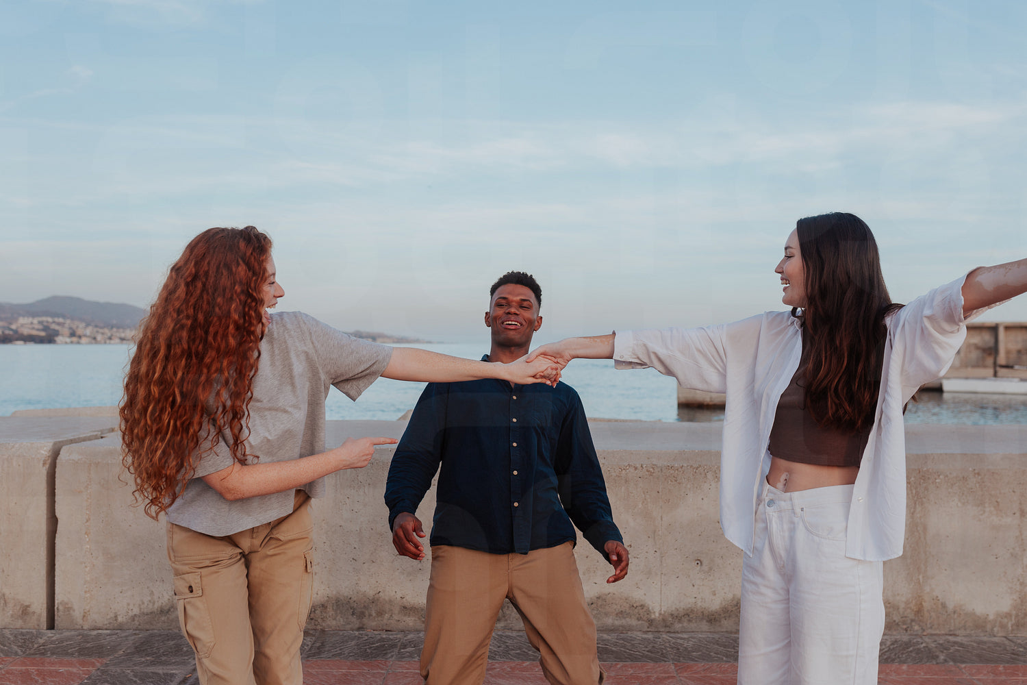 Two girlfriends doing a dance while hanging out with their guy friend in the waterfront. Group of multicultural friends laughing and having a good time. Three friends enjoying their weekend together.