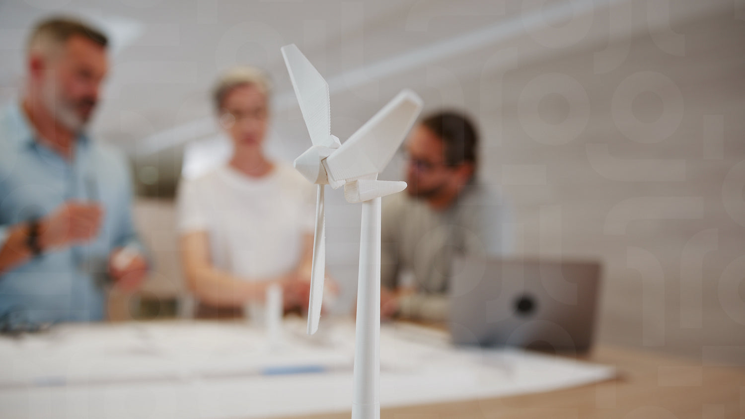3D modeling for a wind energy project: Group of sustainable engineers working together on a windmill design