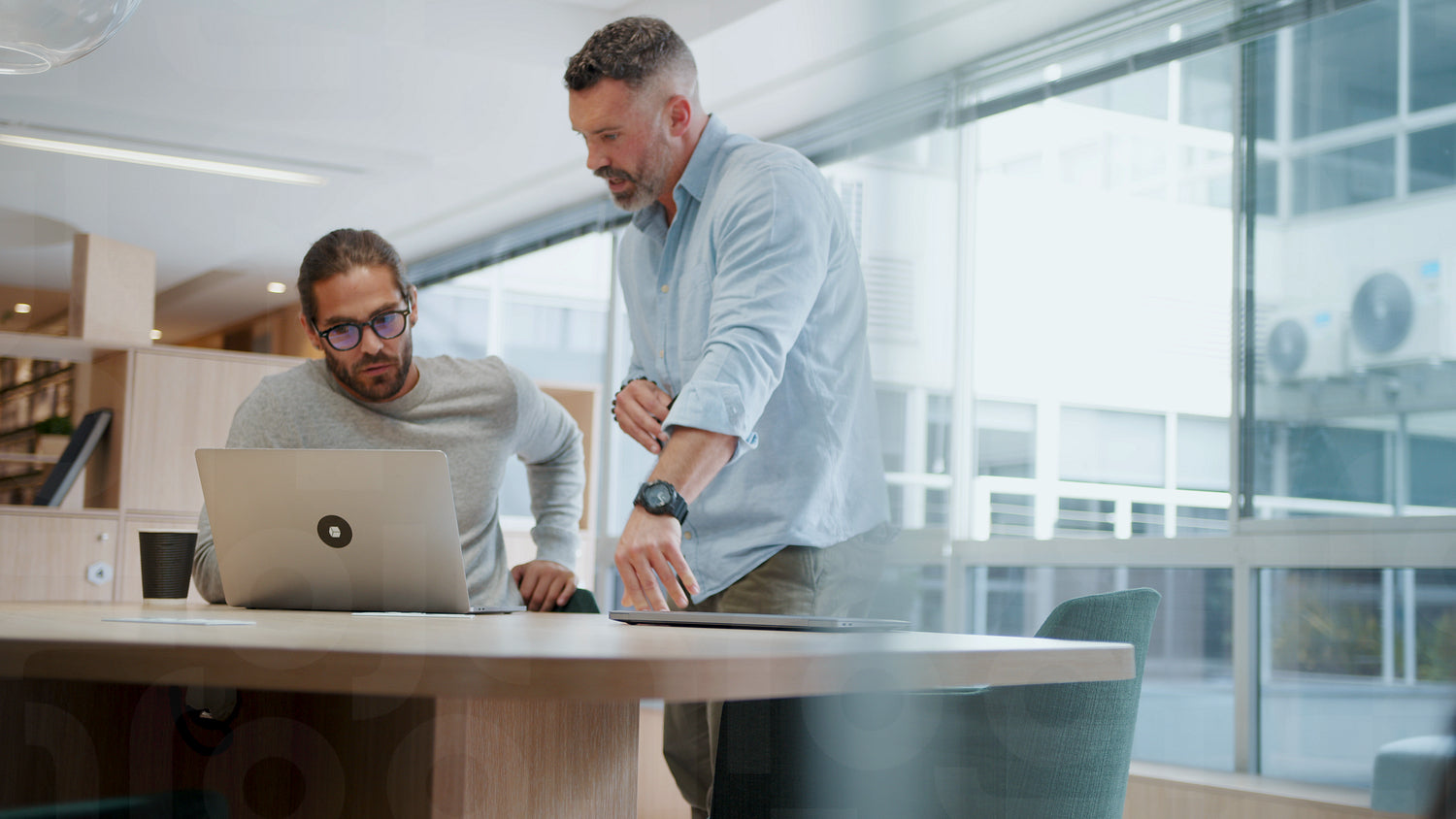 Tech professionals working together to create solutions for their software design project. Business men using a laptop as they discuss ideas for innovative web development.