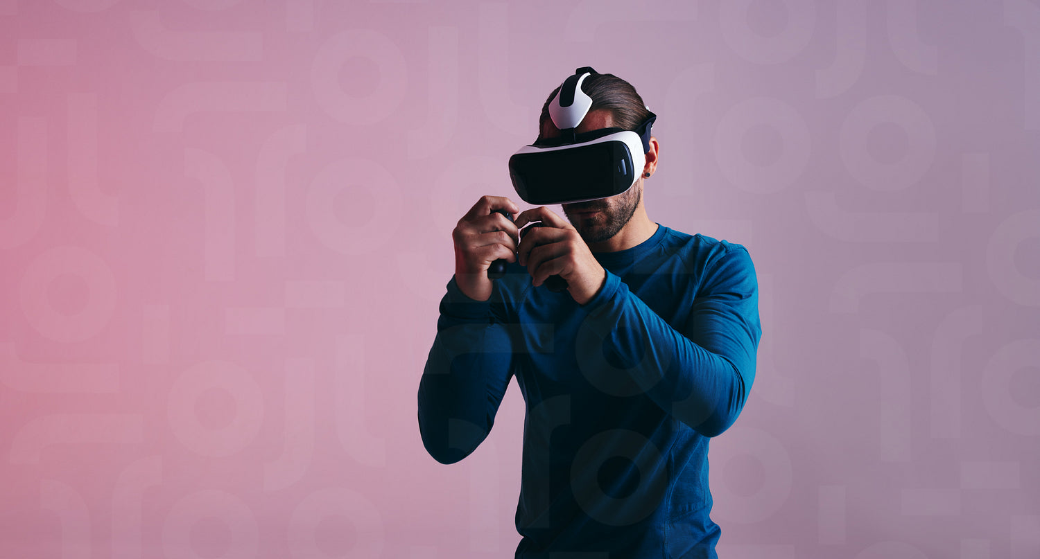 Young man playing a virtual reality boxing game using gaming controllers. Active young gamer wearing a virtual reality headset. Sporty young man exploring 3D video games in a studio.