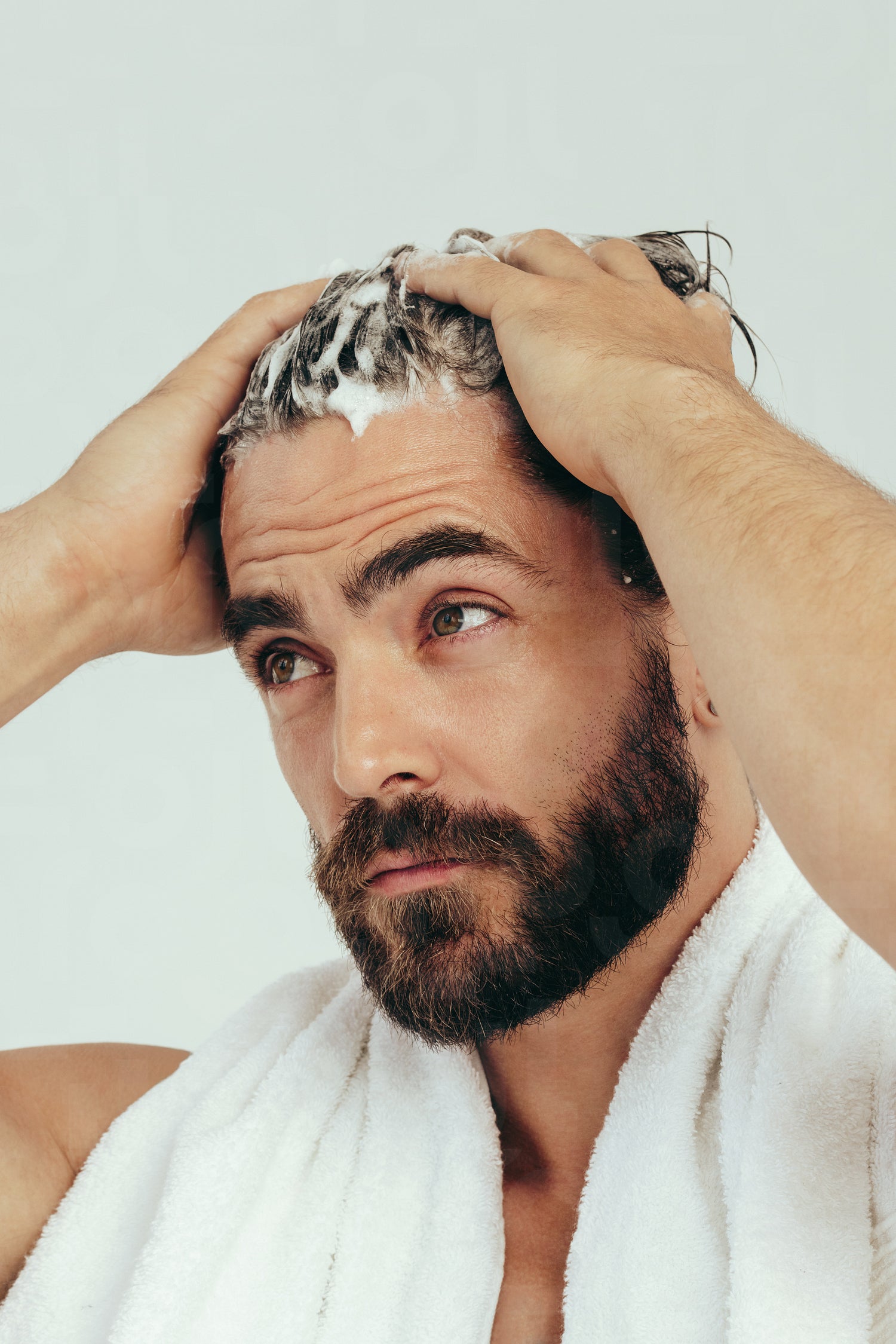 Handsome young man applying shampoo in his hair as he prepares for a thorough, refreshing wash. Man getting into his grooming and self-care routine with a bath towel on his shoulders.