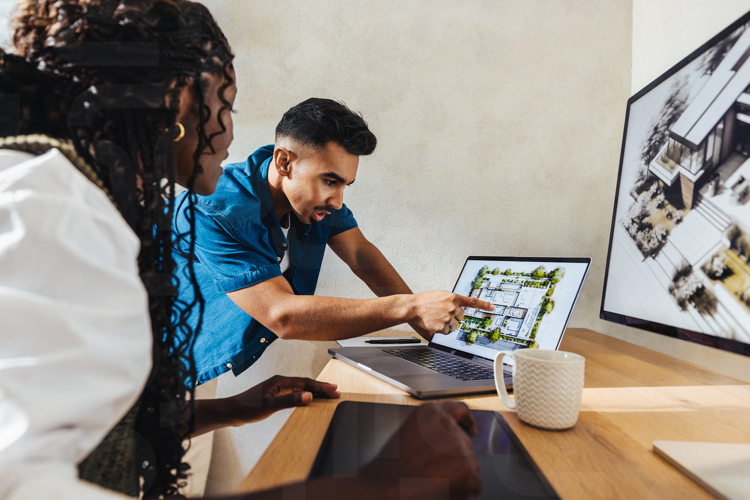 Two professionals engage in collaborative architectural design work, using advanced technology and innovative tools. Their teamwork displays expertise, inspiration, and creativity.