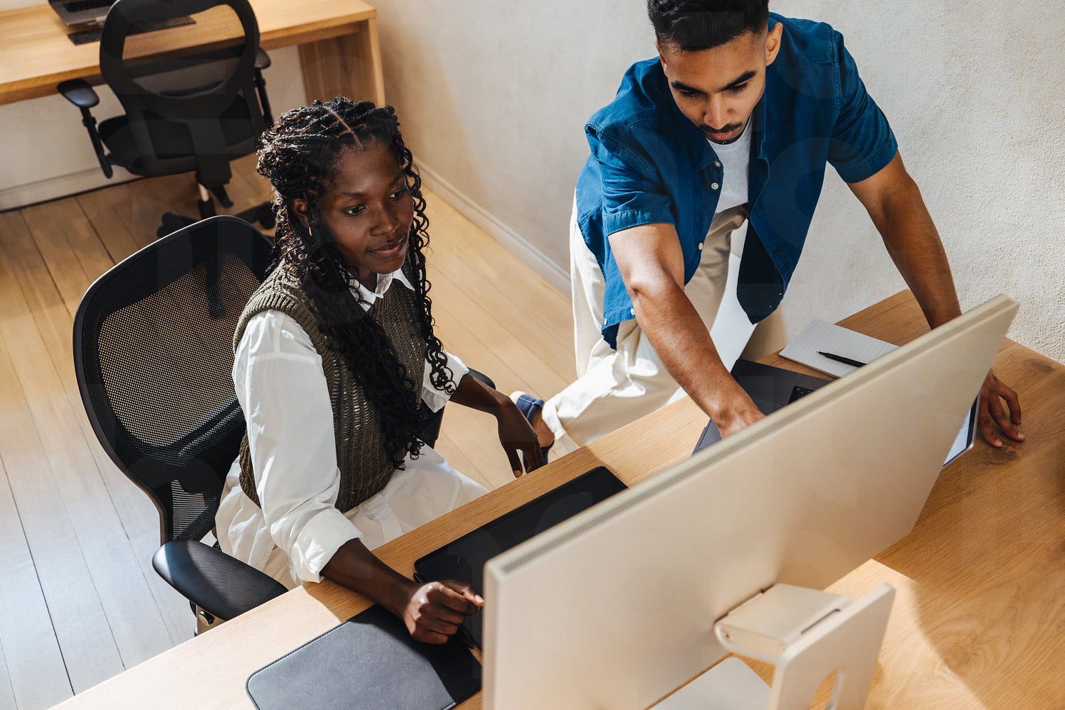 Two colleagues working together on a computer inside a tidy, well-lit office space. They appear focused and engaged in a professional, collaborative setting, emphasizing teamwork and productivity.