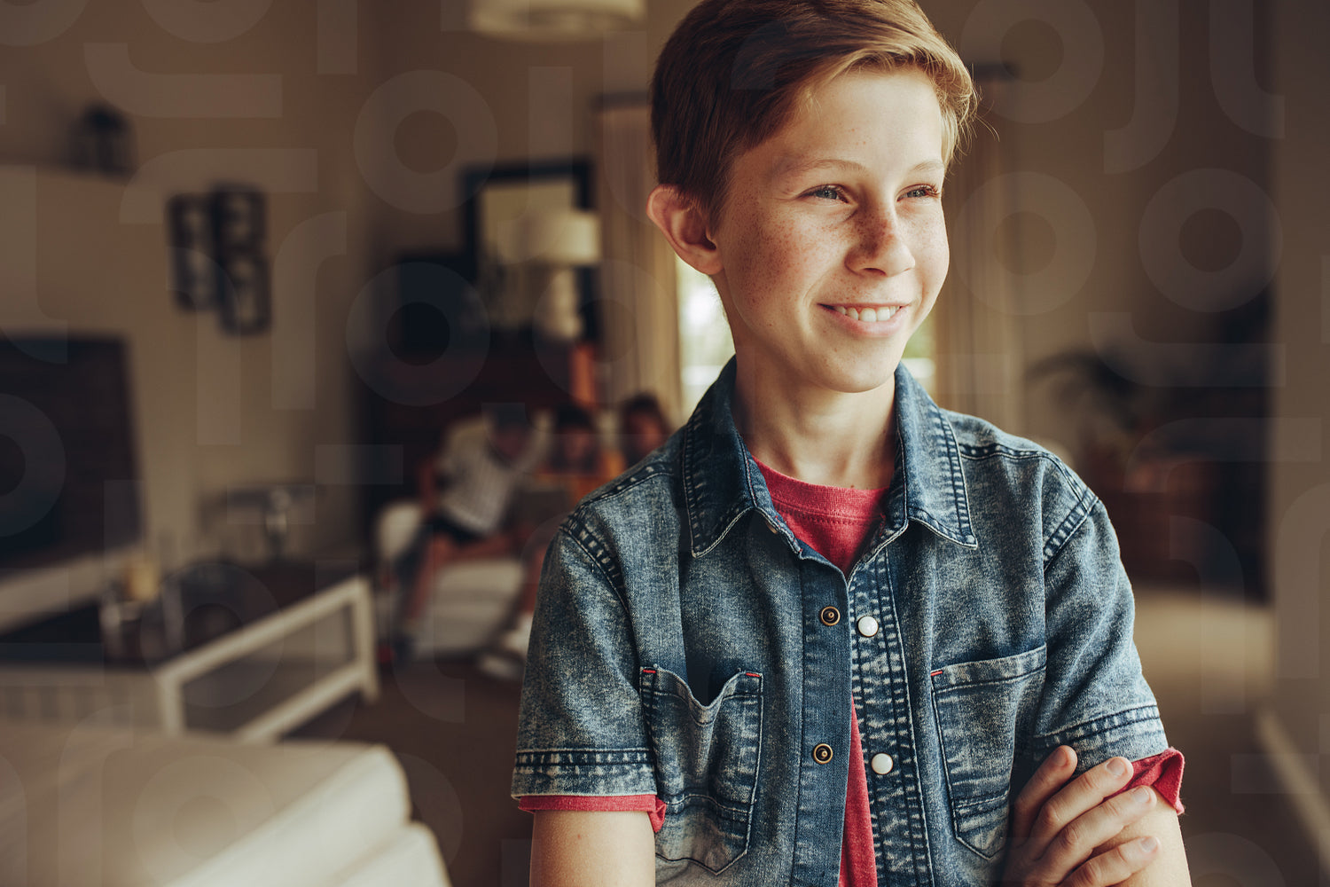 Portrait of a smiling boy standing at home with arms crossed. Boy standing at home and looking away while his friends sitting together in the background.