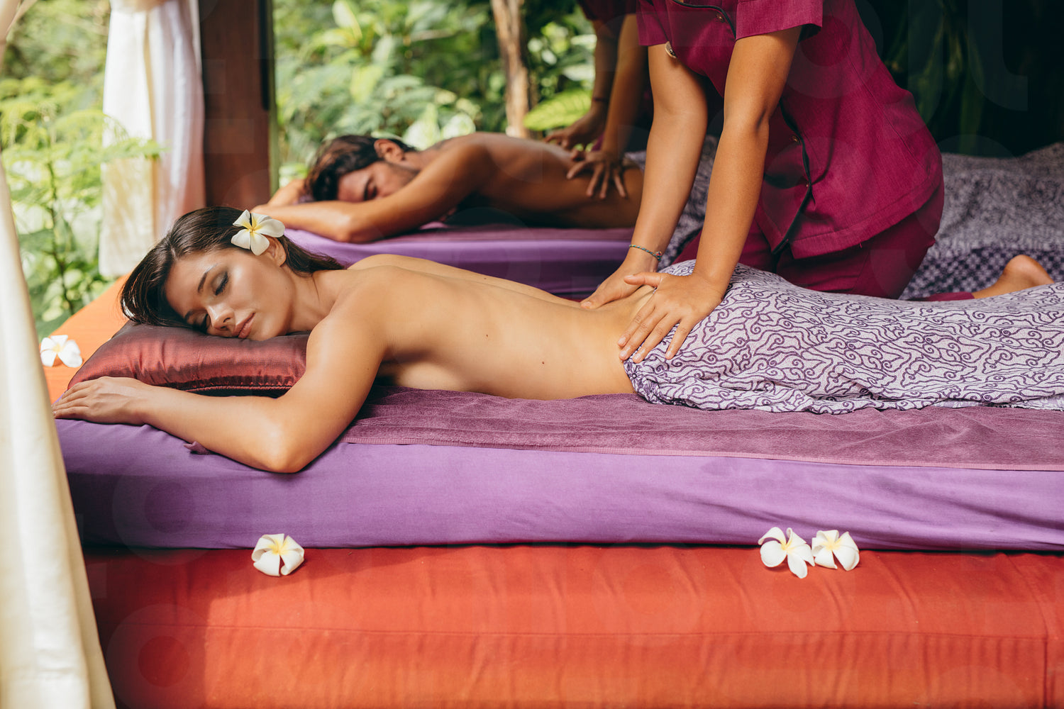 Shot of young man and woman receiving massage at health spa in luxury resort. Couple lying on front at spa center and having back massage. Focus to woman.