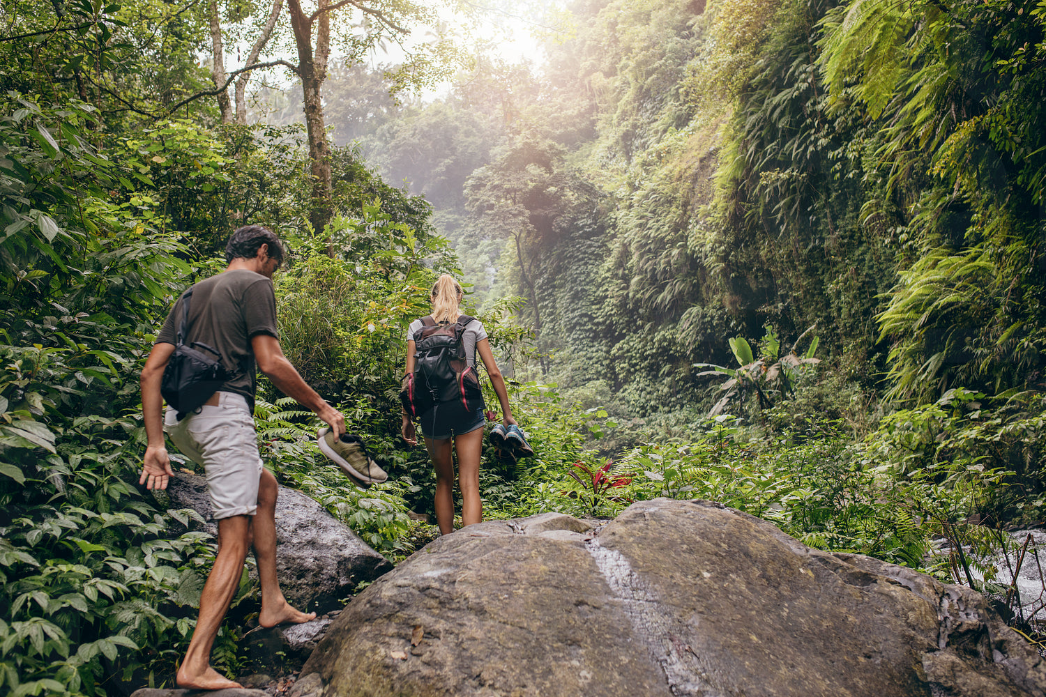 Rear view shot of young couple walking through the forest barefooted. Man and woman hiking on mountain trail.