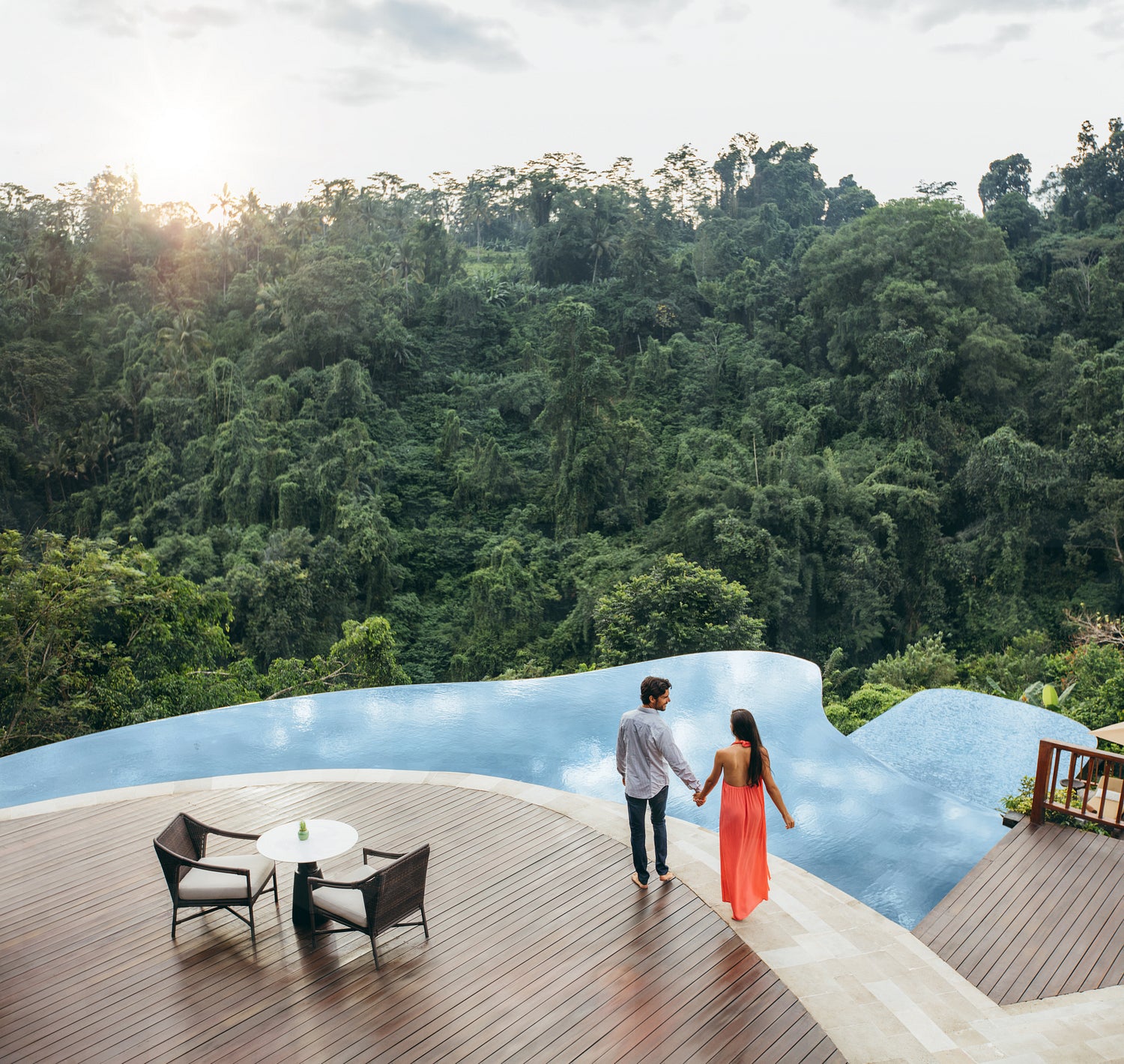 Aerial shot of young man and woman holding hands while standing by swimming pool. Couple in love near holiday resort poolside.