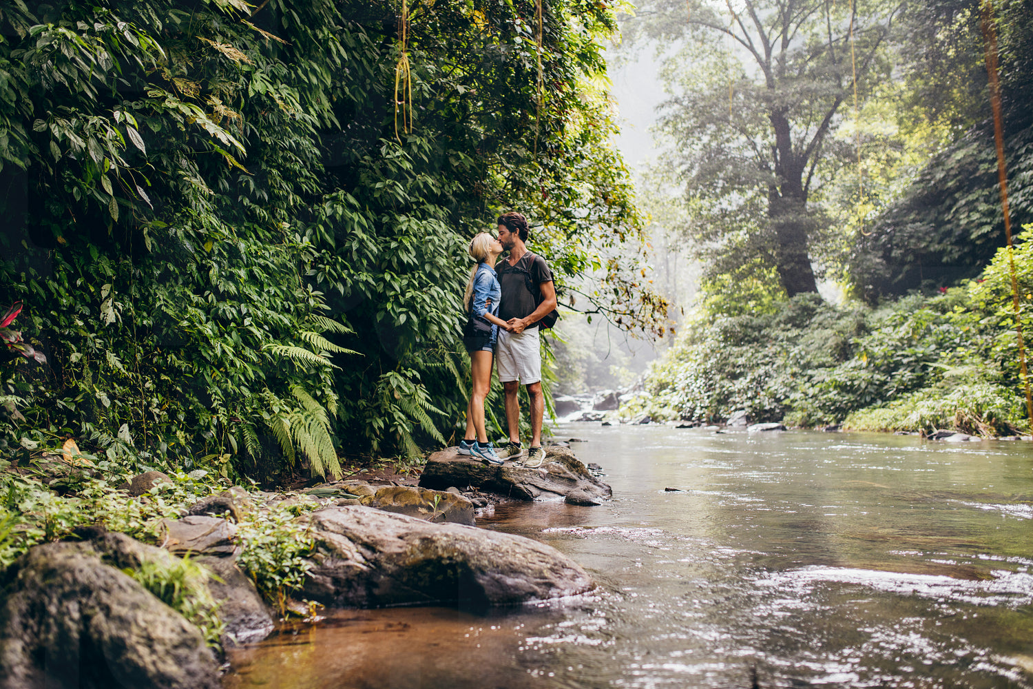 Couple standing on rocks by mountain stream and kissing. Affectionate young man and woman by the forest creek.