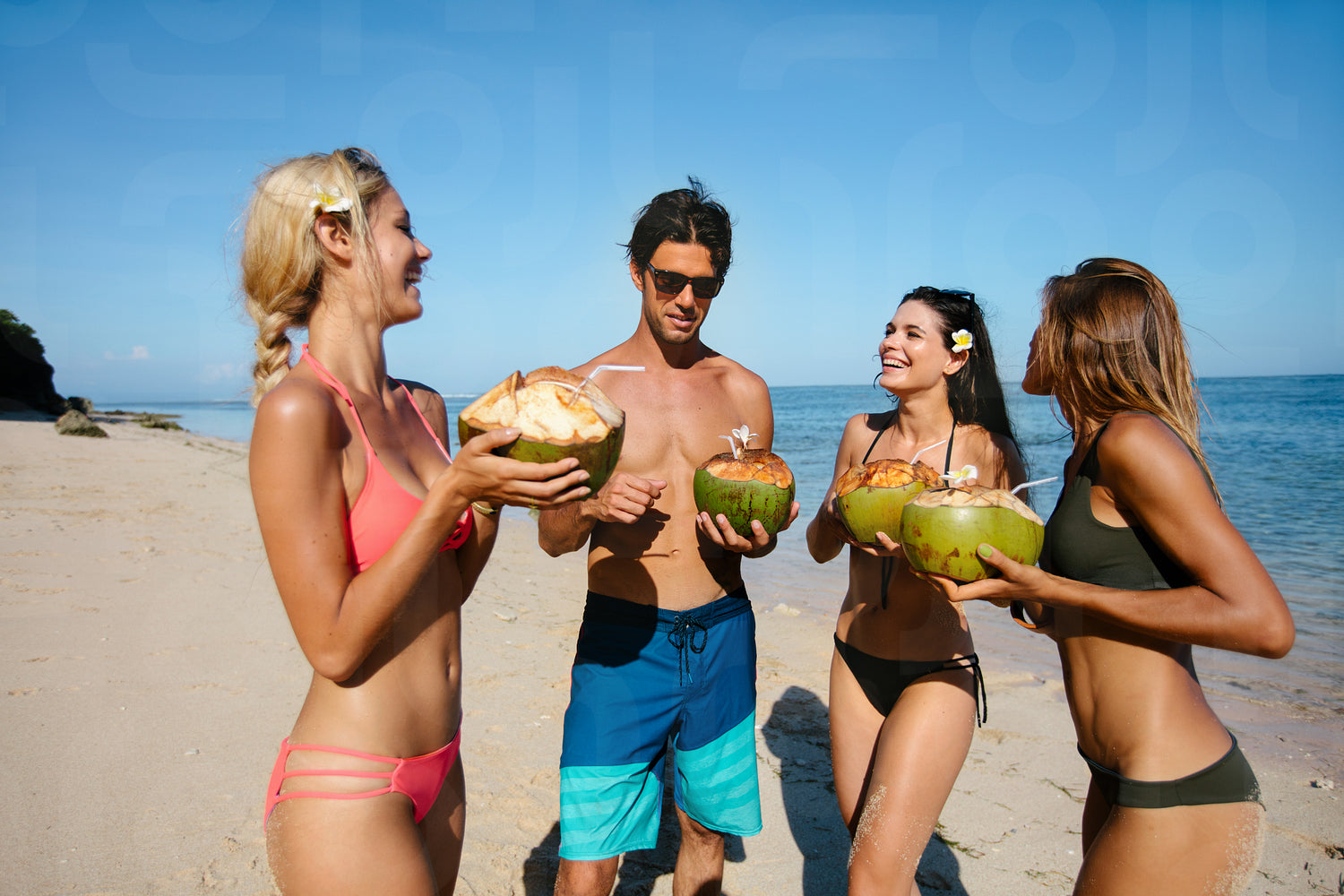 Portrait of young man and women drinking fresh coconut water by the sea. Group of young friends having fun on summer beach vacation. Young people in swimsuits.
