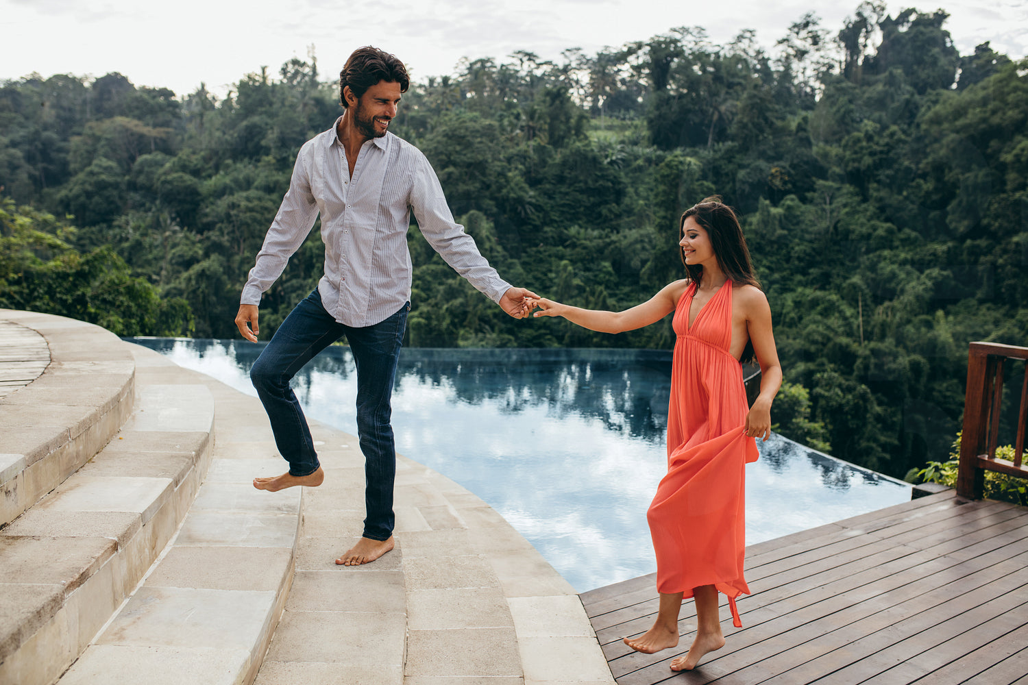 Portrait of young man and woman in love walking by swimming pool. Young couple at poolside of holiday resort.
