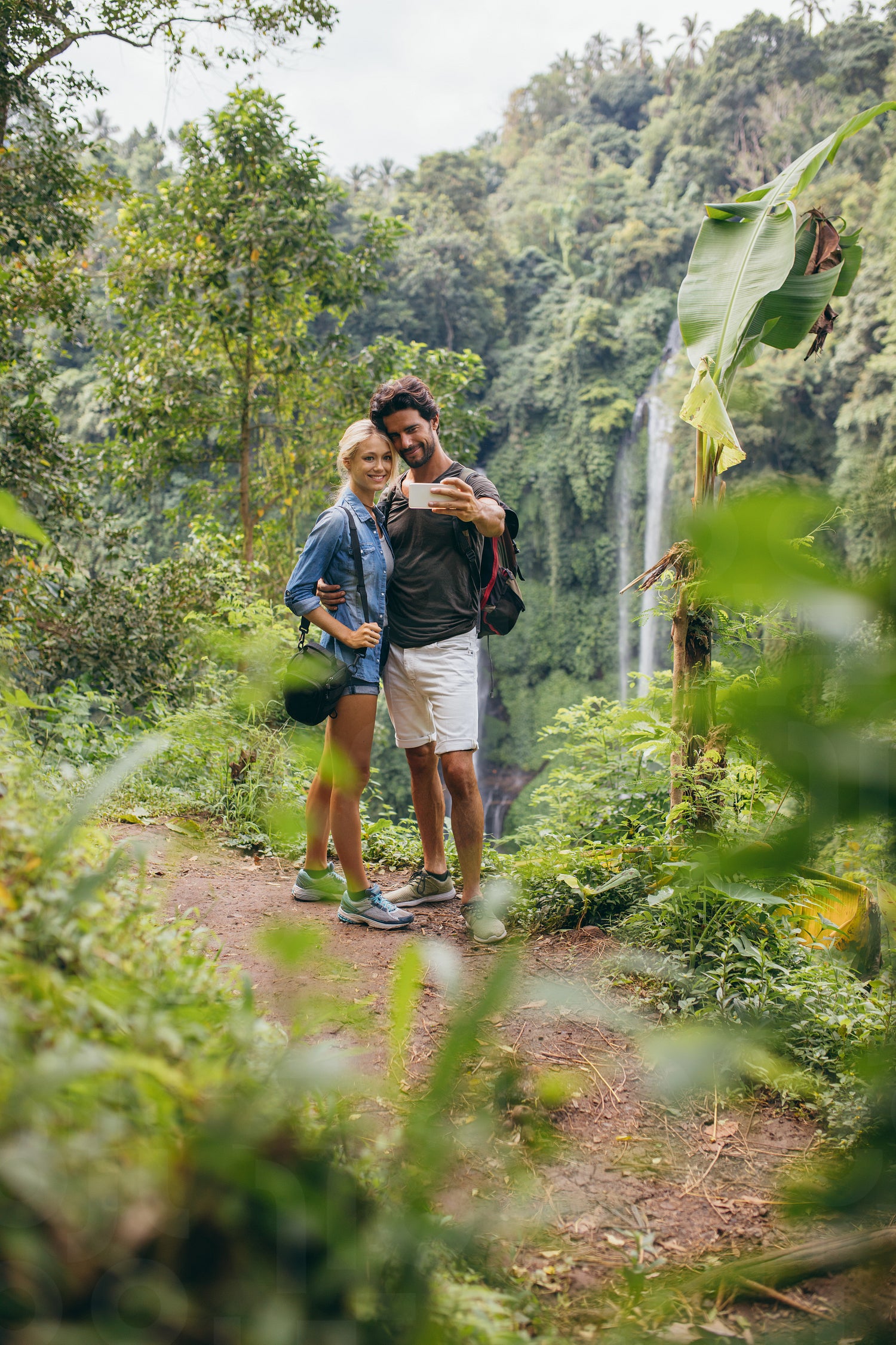 Loving young couple taking self portrait with their mobile phone. Man and woman in forest taking selfie.