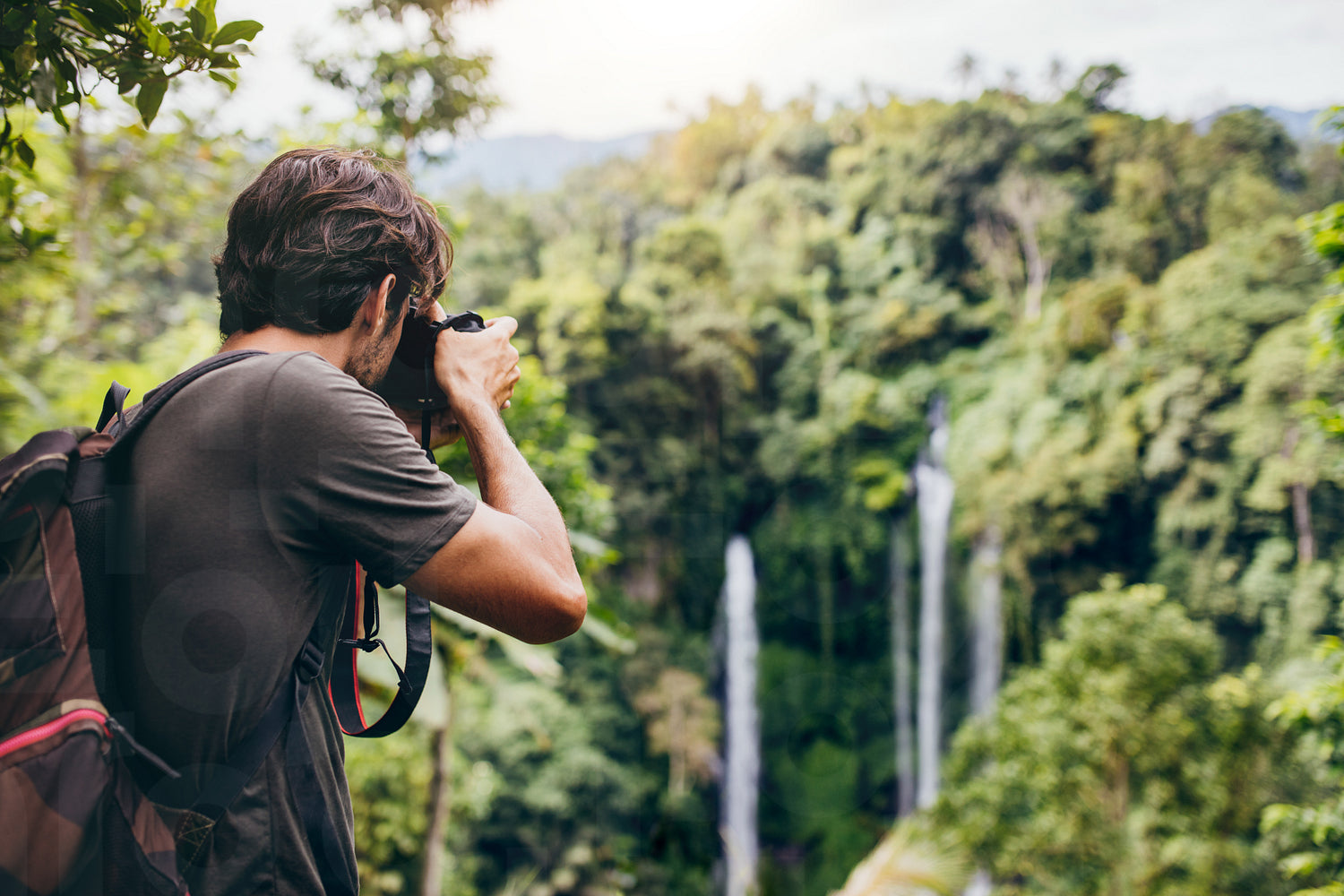 Man with backpack standing in front of waterfall and taking a photo. Male hiker photographing a beautiful water fall in forest