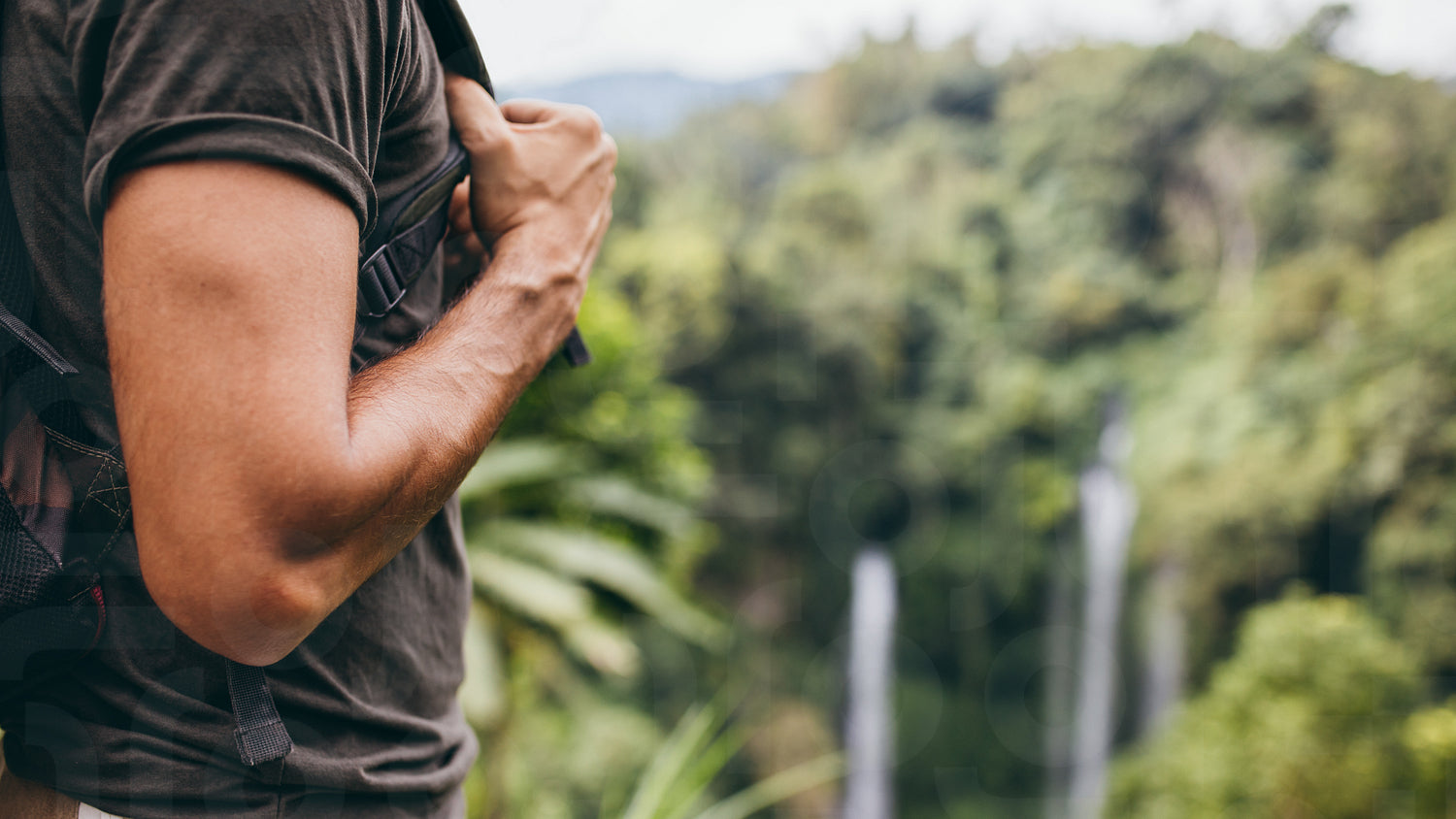 Close up shot of young man hand with backpack standing in nature near a waterfall. Man hiking near waterfall in forest.