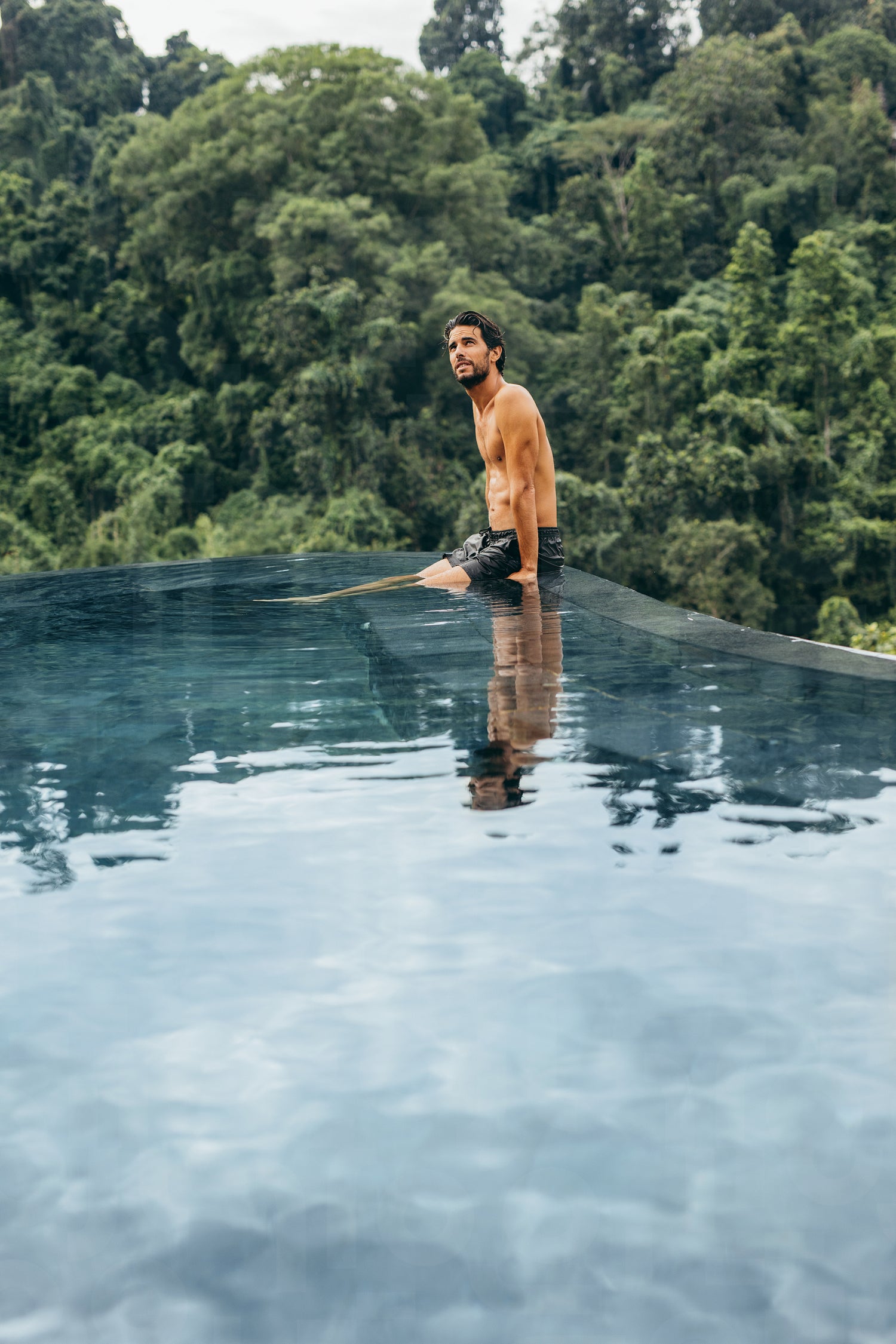 Shot of young man shirtless sitting on the edge of swimming pool at resort and looking away. Caucasian male on vacation relaxing in a pool.