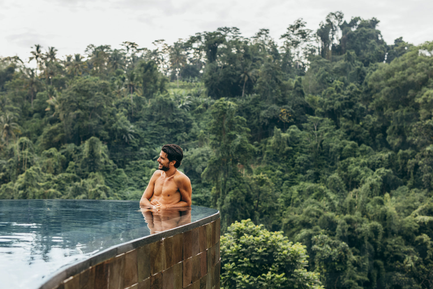 Shot of young man standing in a swimming pool and looking away. Male model relaxing in a pool at resort.