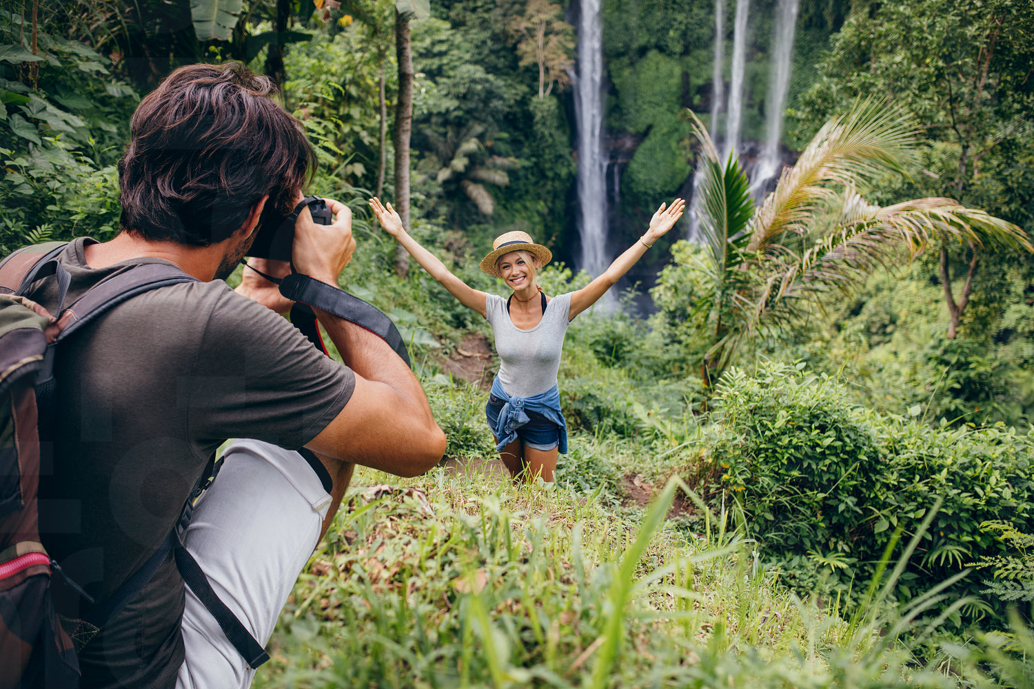 Male photographer taking pictures of a young woman standing in front of waterfall in forest. Couple enjoying a day in forest.