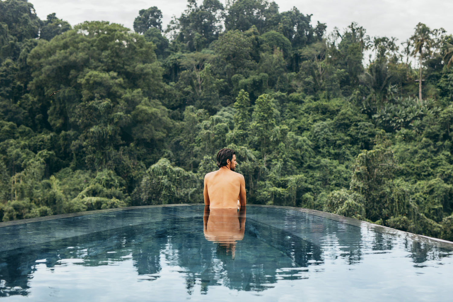 Rear view shot of caucasian male relaxing in a pool and looking at a view. Young man standing in a infinity pool at resort.