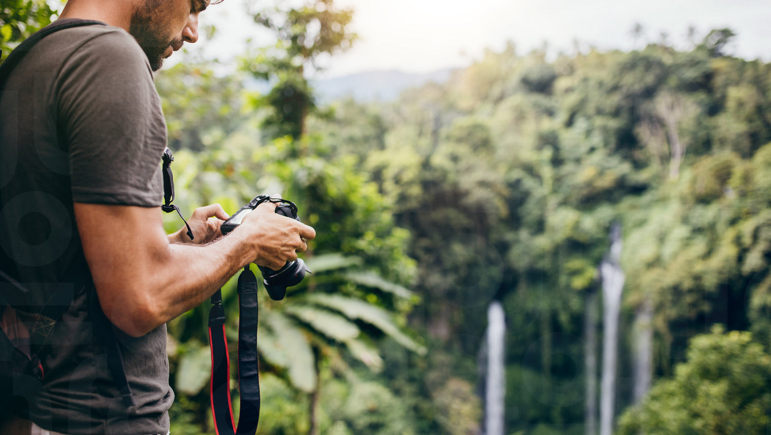 Young man looking at his camera while standing by a waterfall in forest. Male hiker standing on a cliff and looking the waterfall pictures in his digital camera.