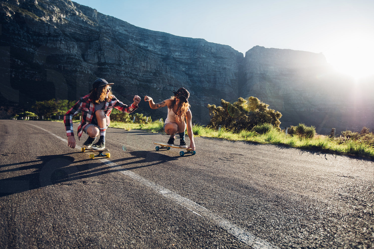 Best friends having fun with skateboard on open road. Young man and woman longboarding together on a sunny day.