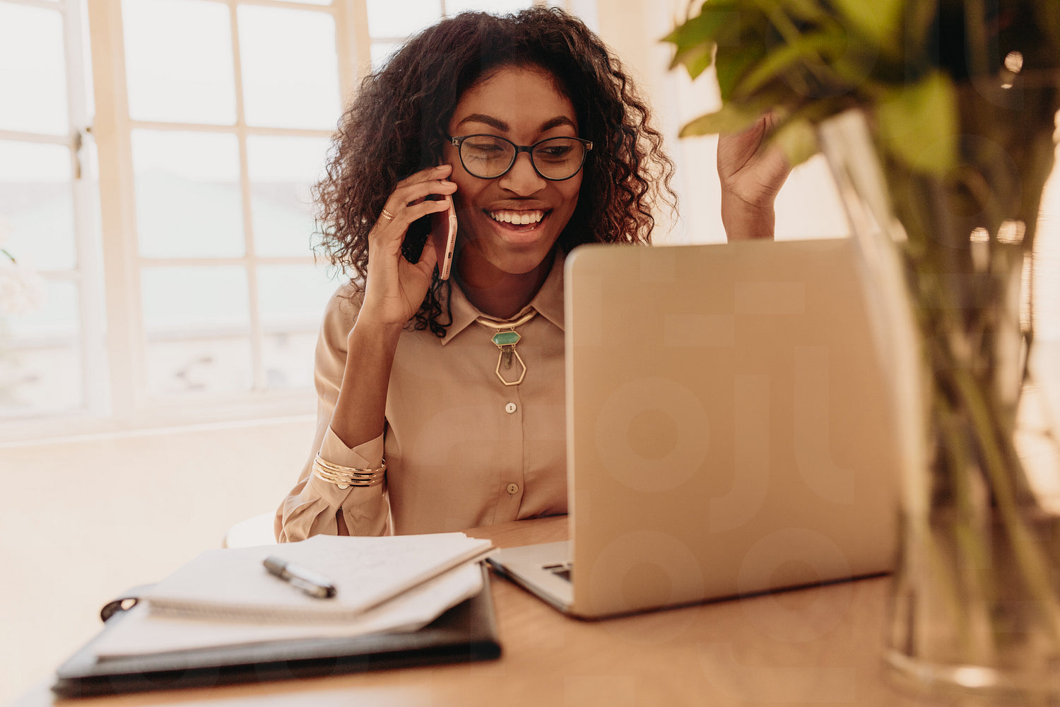 Woman entrepreneur managing her business from home working on laptop computer and discussing business over mobile phone. Businesswoman sitting at home talking on mobile phone while working on laptop.