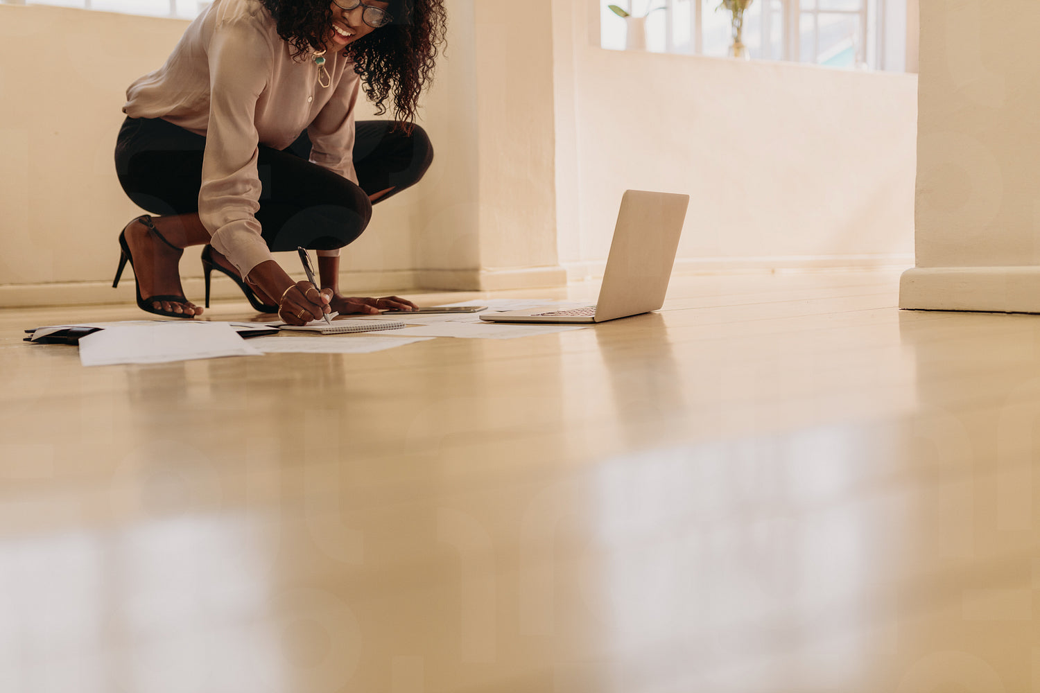 Woman entrepreneur in formal attire making notes while working on laptop computer at home. Businesswoman sitting on floor wearing sandals at home making notes with business papers and laptop by her side.