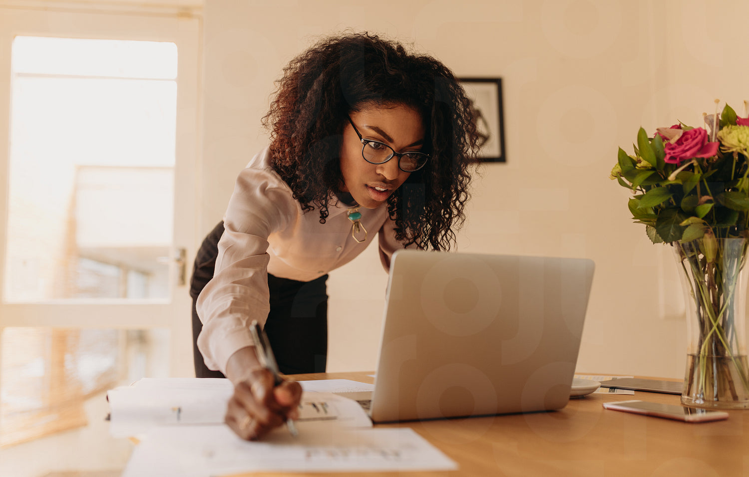 Businesswoman making notes looking at a laptop computer at home. Woman entrepreneur leaning over the table to write notes while looking at the laptop.