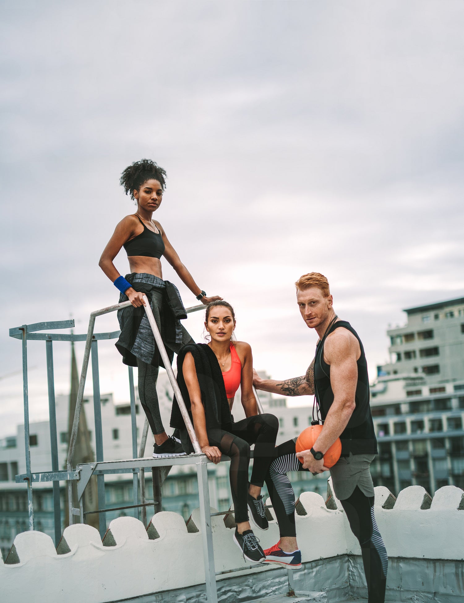 Group of fitness people standing on stairs of a terrace after workout. Fitness man holding a basketball standing with two female athletes on rooftop after fitness training.