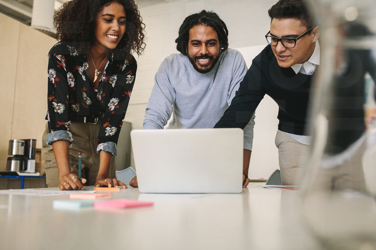 Business colleagues discussing work looking at a laptop