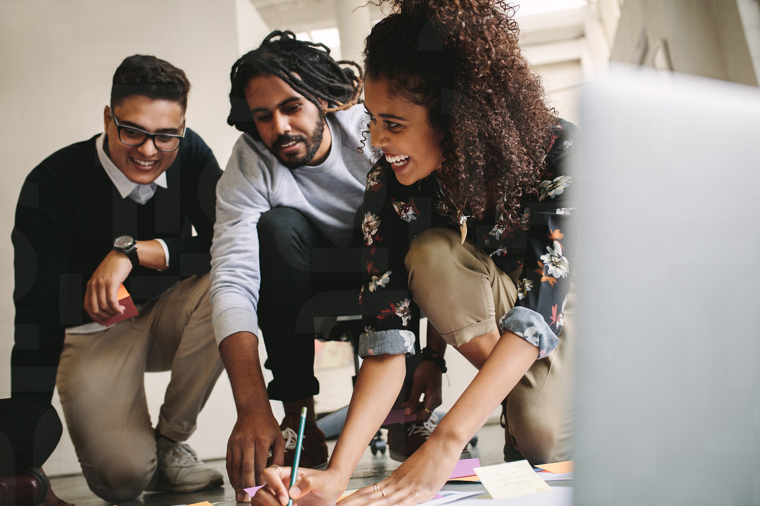 Smiling businesswoman writing down sitting on floor while her colleagues look on. Creative business people working together on an idea sitting on floor with a laptop.