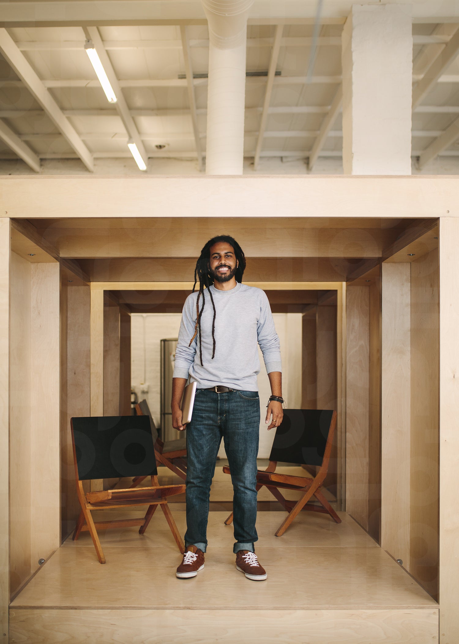 Smiling businessman holding laptop standing inside an enclosure with seats at office. Businessman with long hair standing with a laptop.