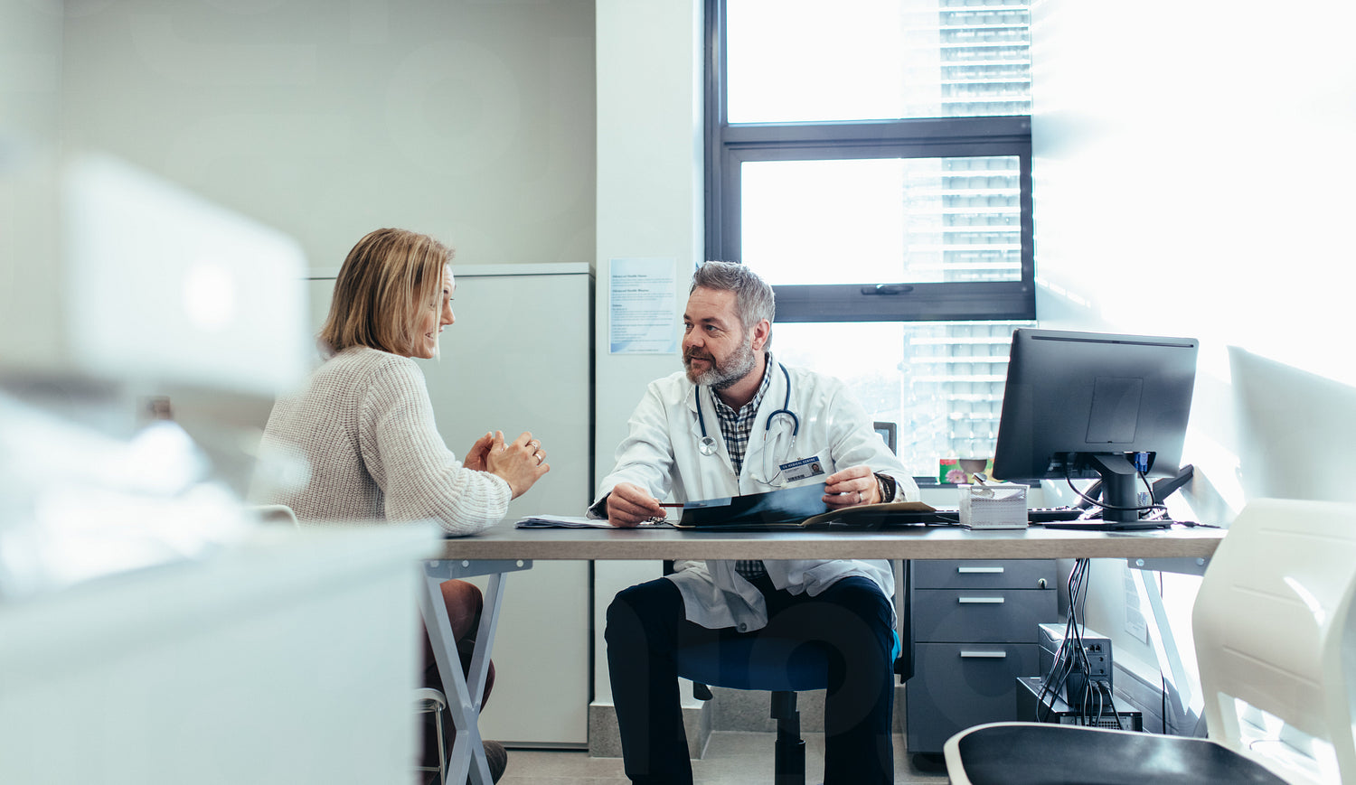 Medical specialist discussing with female patient in his clinic. Doctor with patient during consultation in medical office.