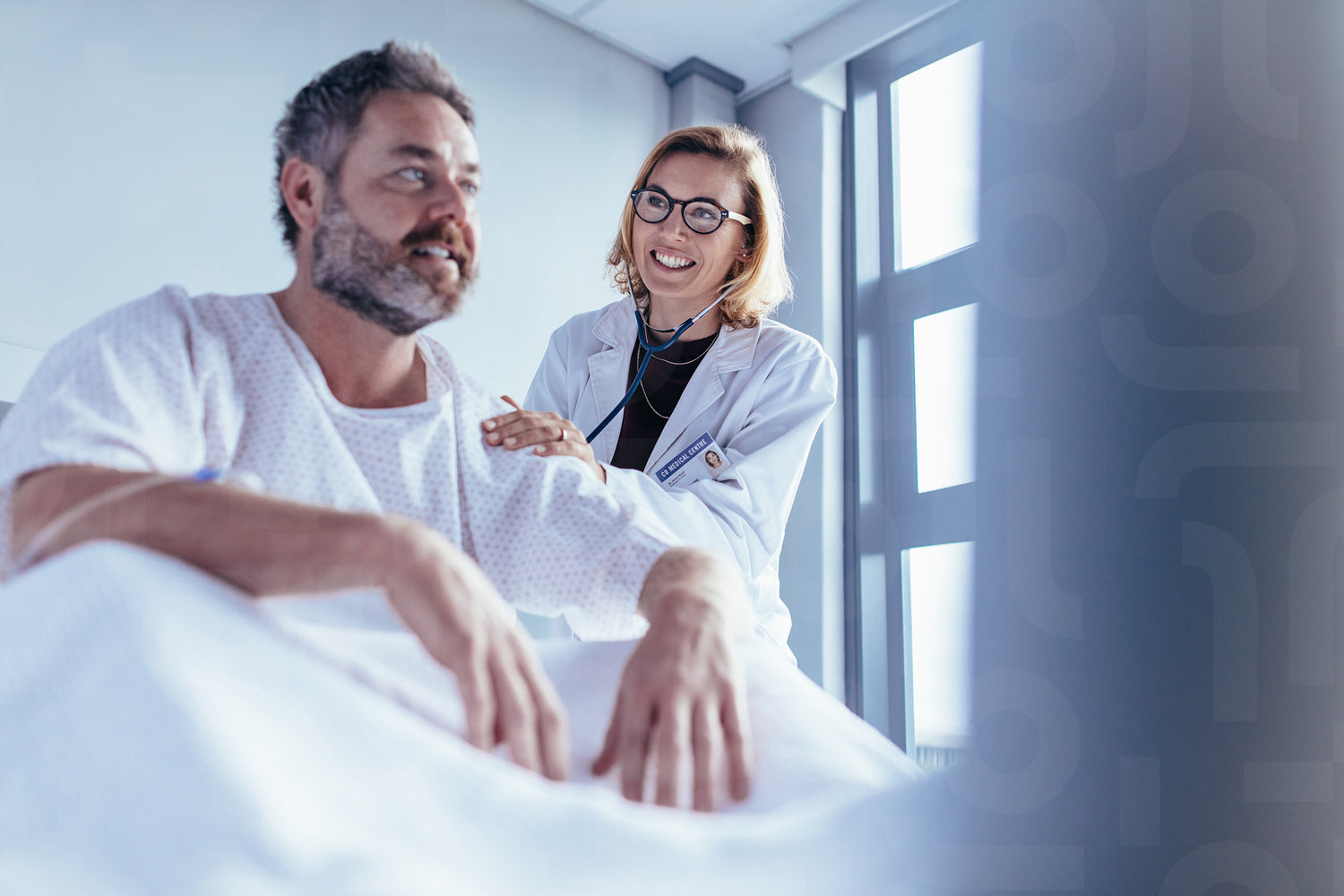 Female doctor checking male patient. Doctor visiting and talking with patient sitting in a hospital bed.