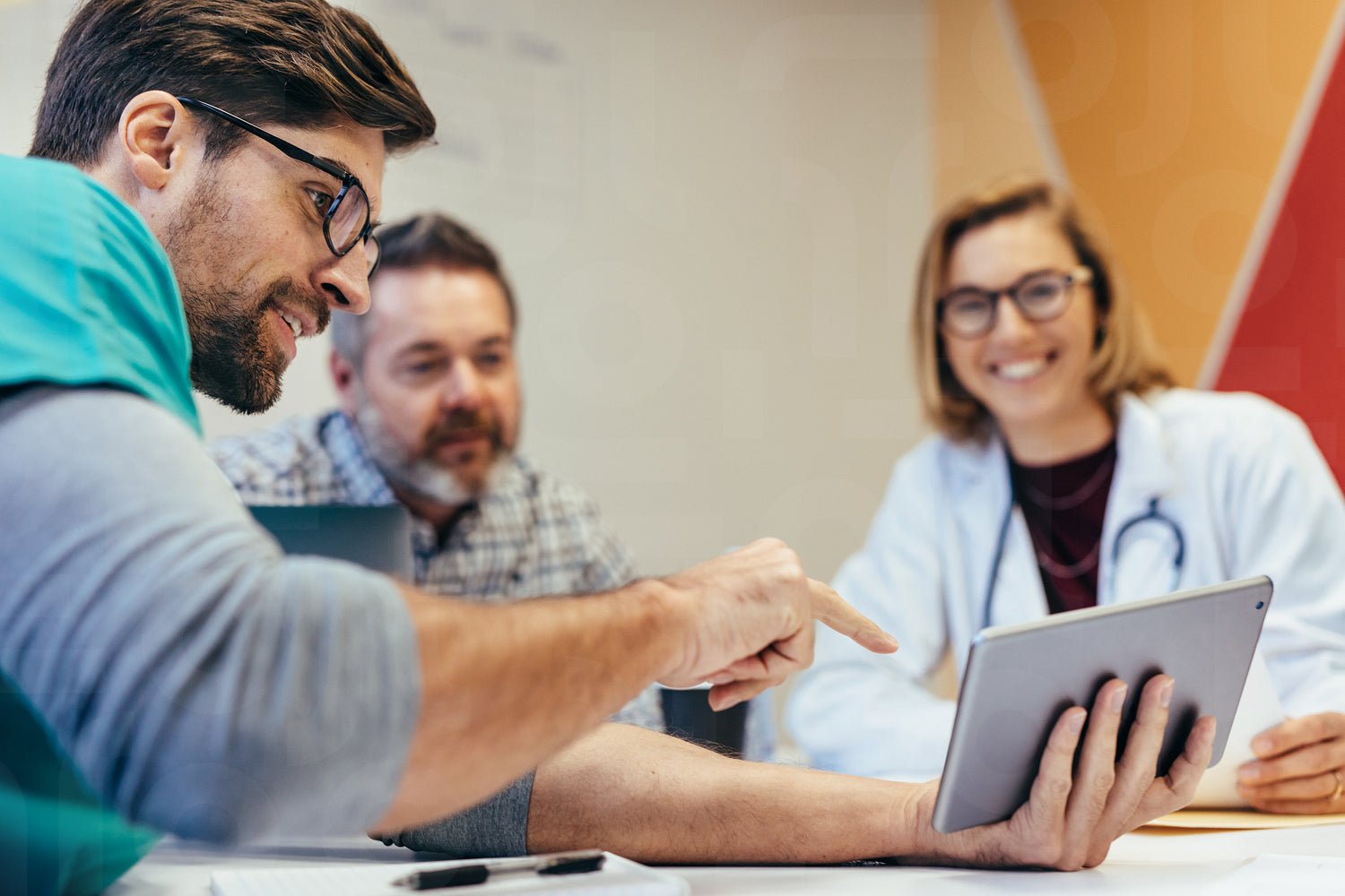 Medicine professional presents his planning to team in meeting. Morning briefing of medical staff in boardroom.